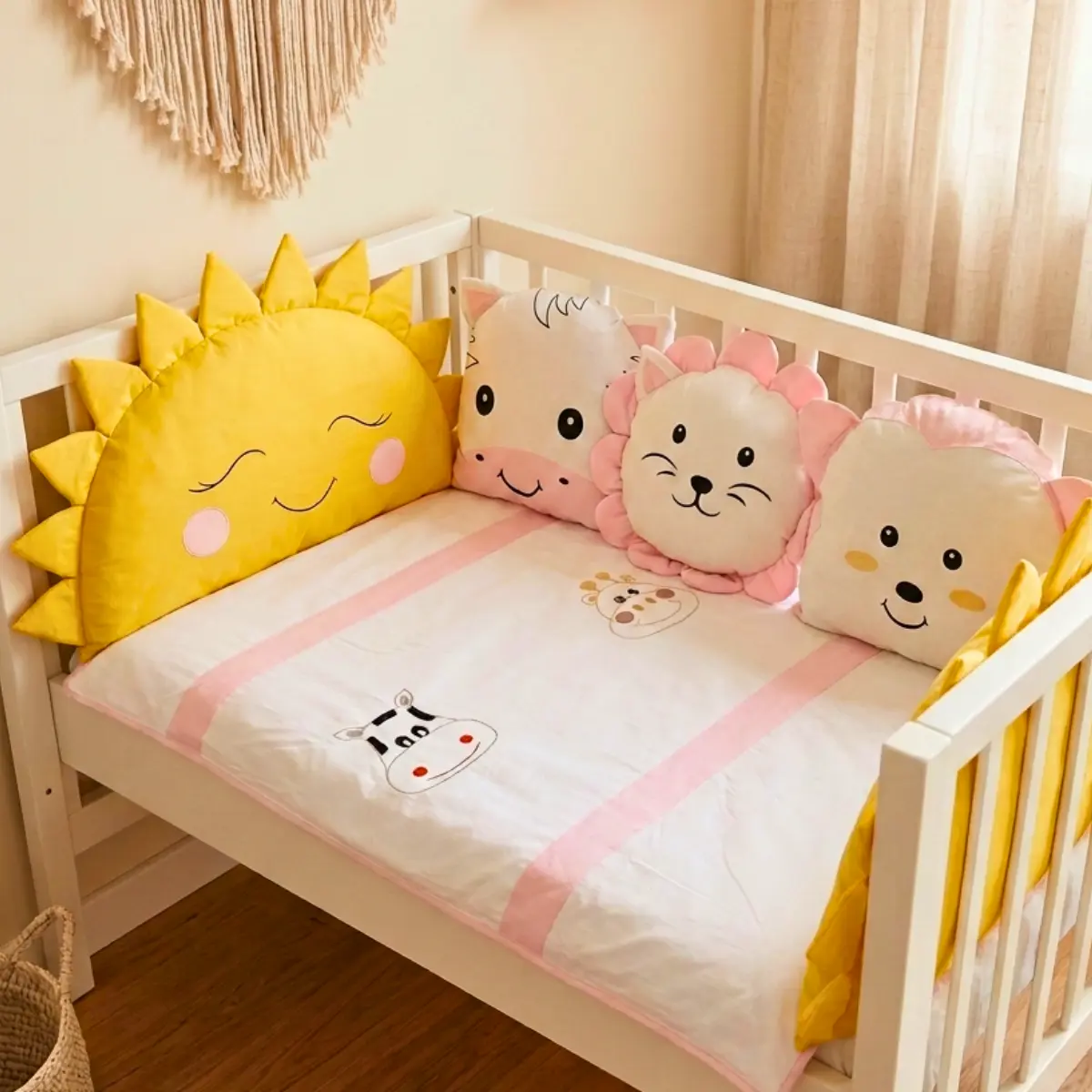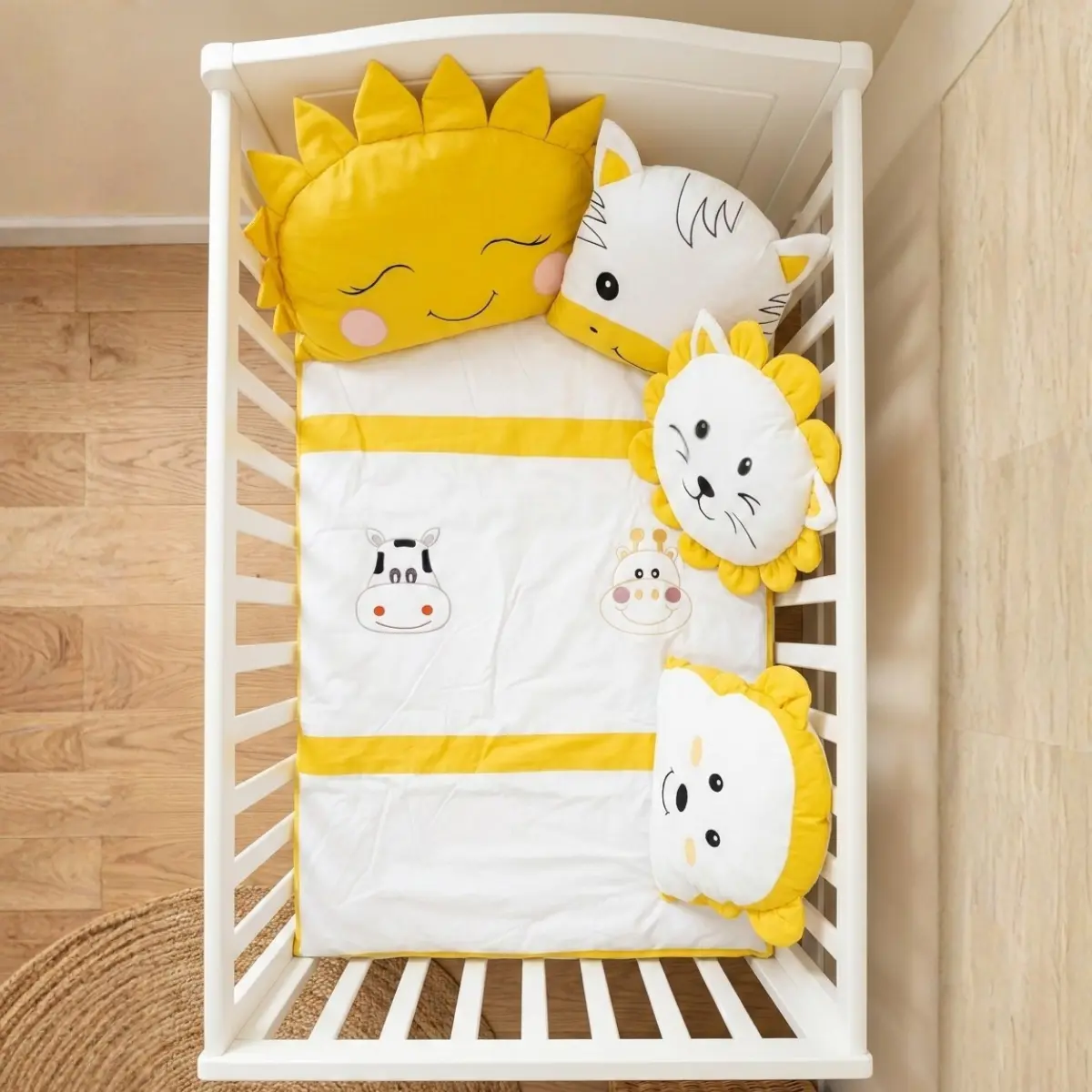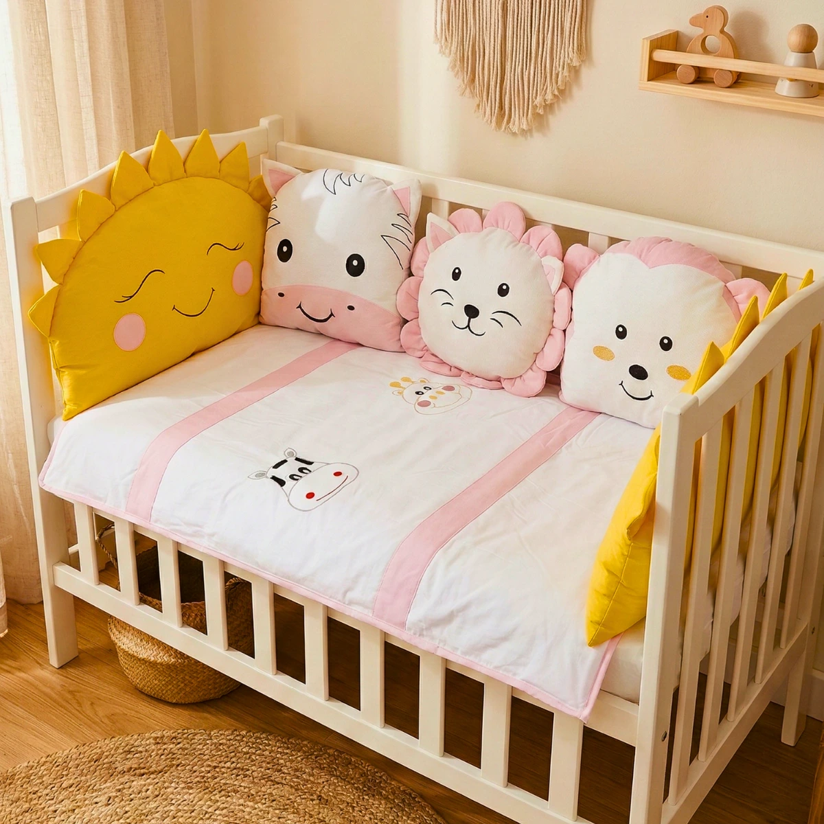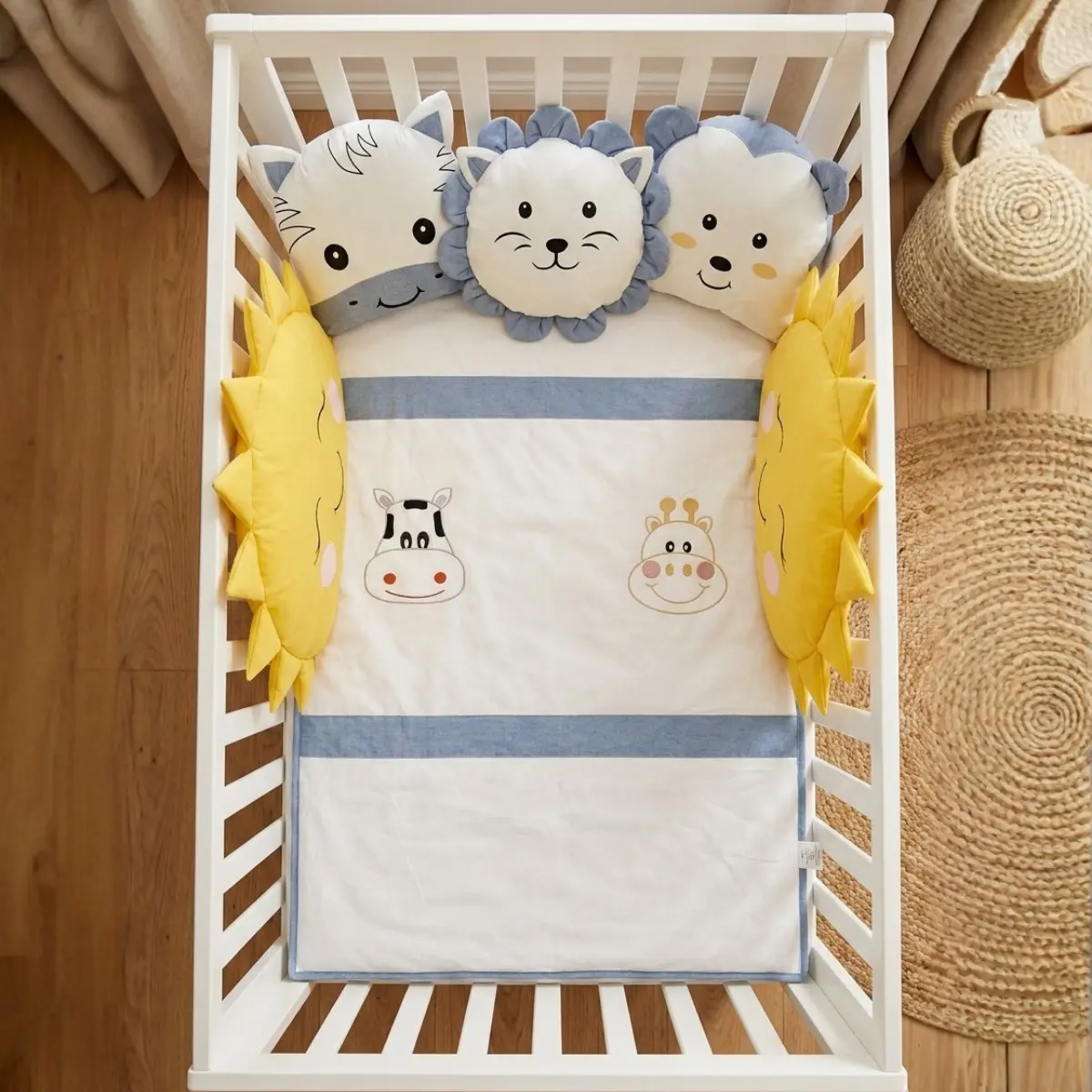 Animals bebek uyku seti; beyaz kumaş üzerine pembe, sarı, kahverengi ve mavi renklerdeki kumaşlar ile özenle kombinlenerek hazırlanmış, sevimli zürafa ve inek nakış işlemeli zarif bir safari temalı tasarımdır. Bebeğinizin odasına hem şıklık katar hem de sağlıklı bir uyku ortamı sunar.