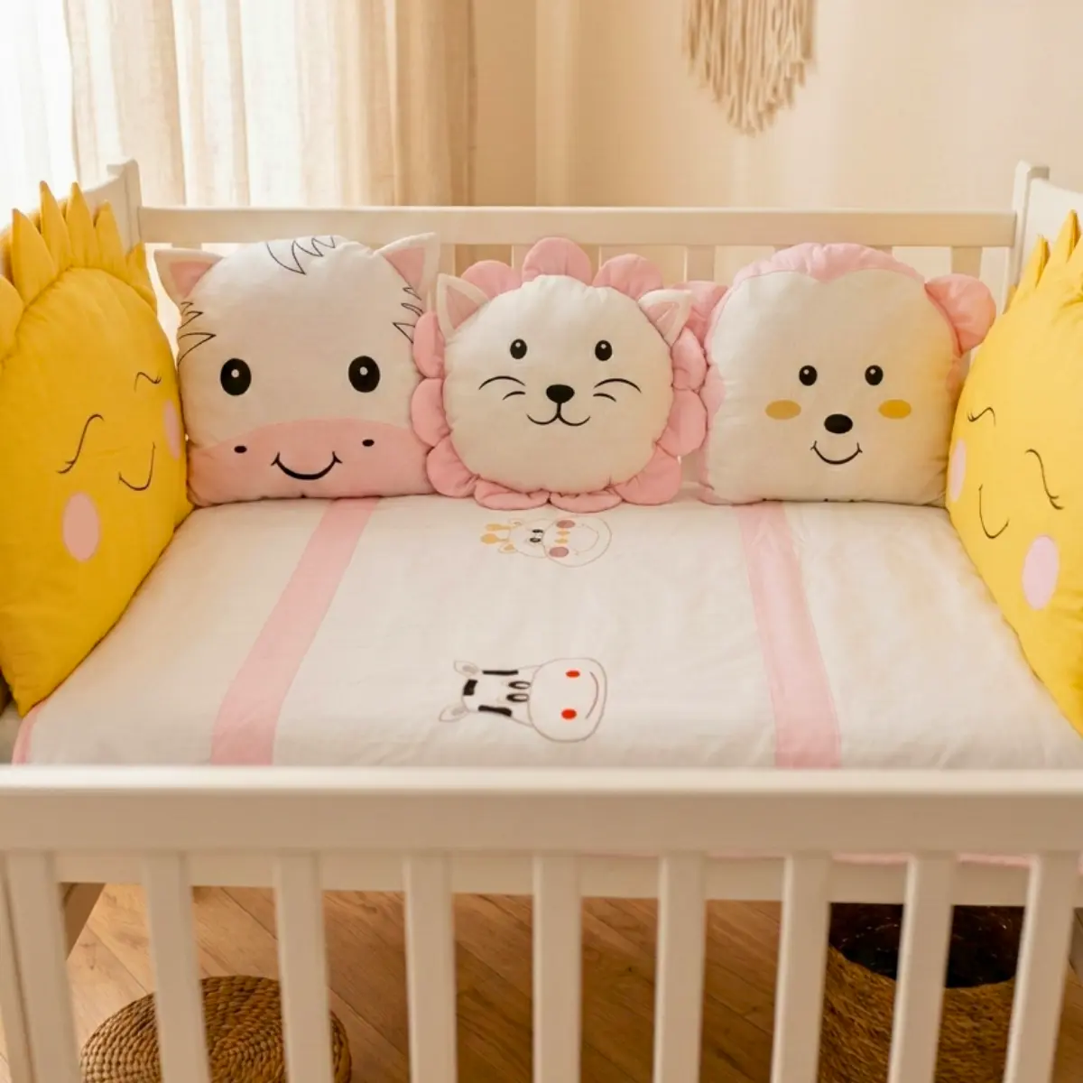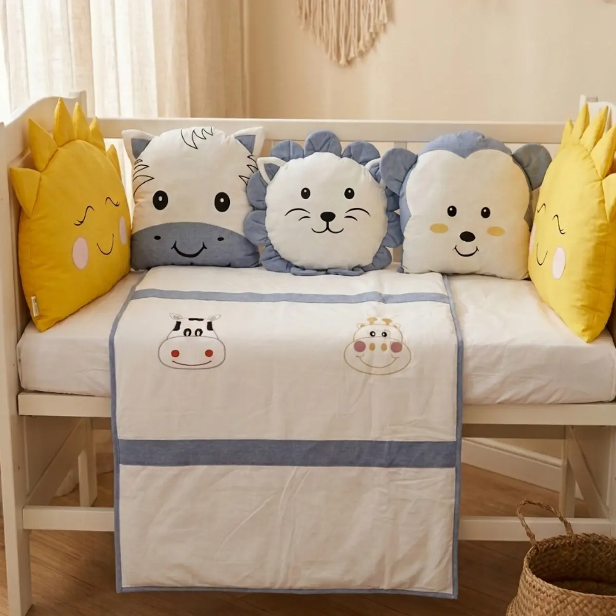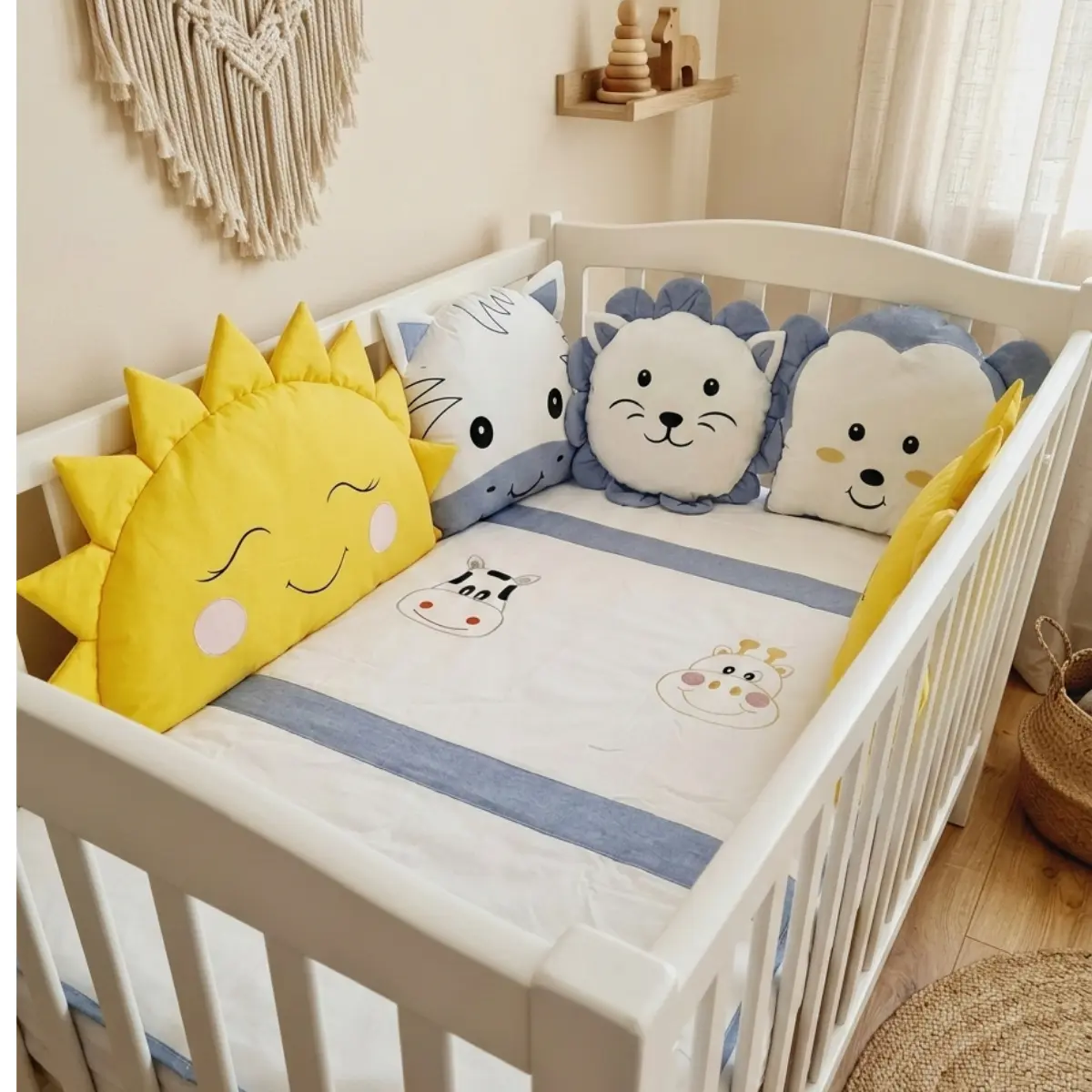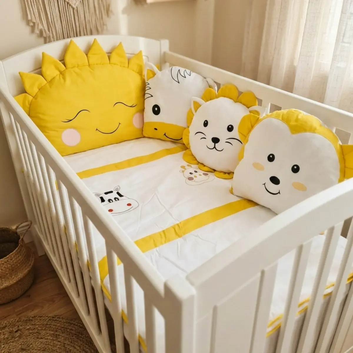 Animals bebek uyku seti; beyaz kumaş üzerine pembe, sarı, kahverengi ve mavi renklerdeki kumaşlar ile özenle kombinlenerek hazırlanmış, sevimli zürafa ve inek nakış işlemeli zarif bir safari temalı tasarımdır. Bebeğinizin odasına hem şıklık katar hem de sağlıklı bir uyku ortamı sunar.