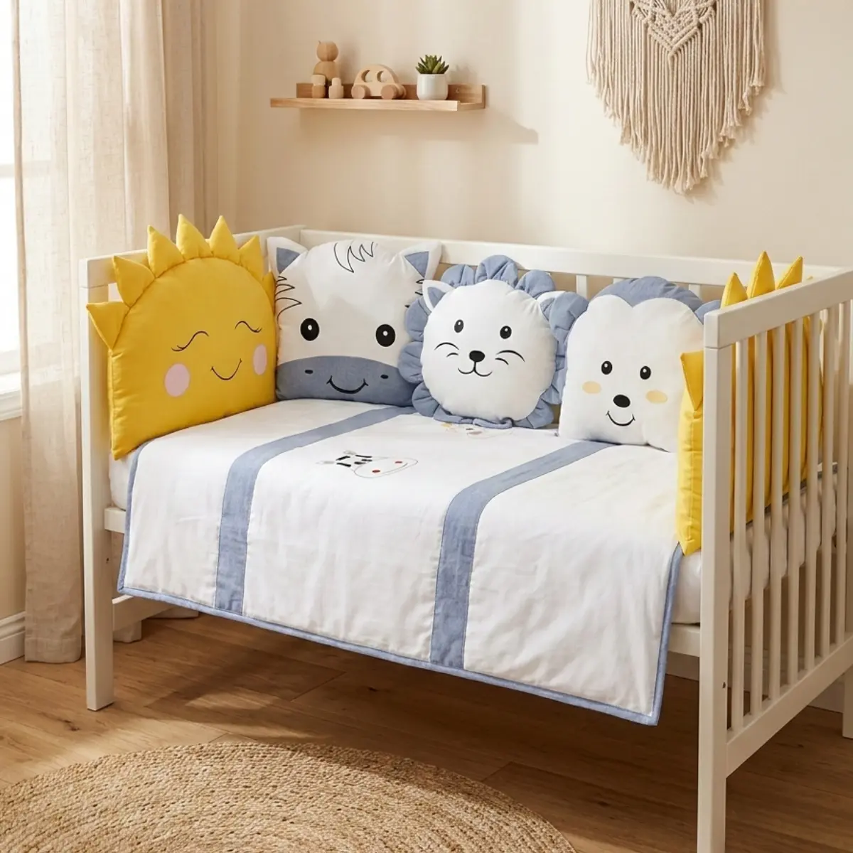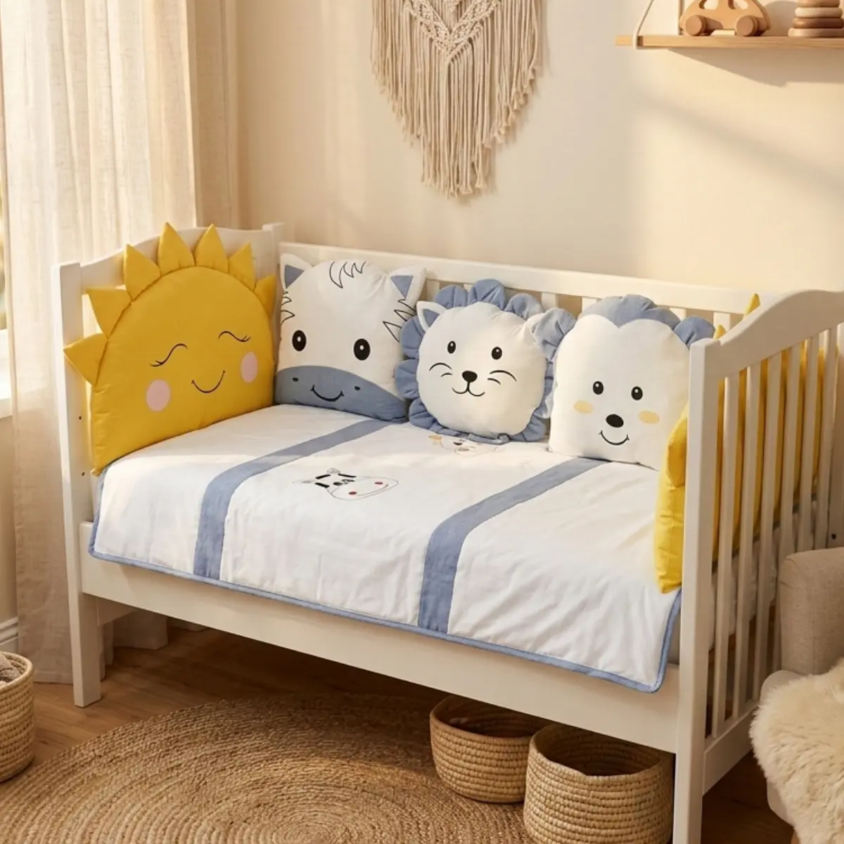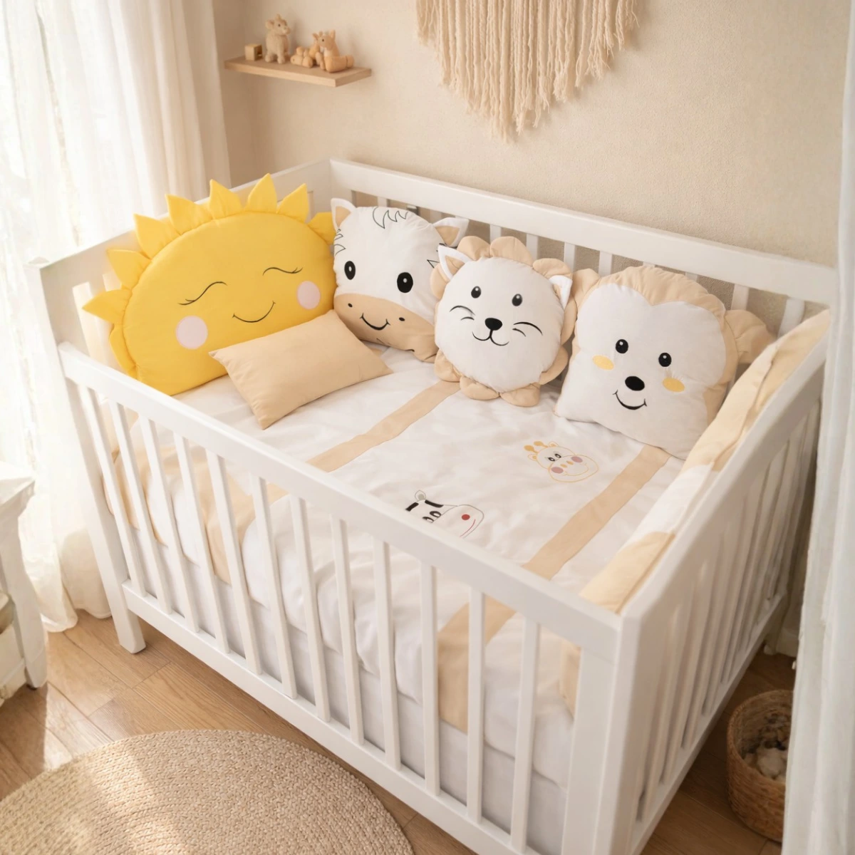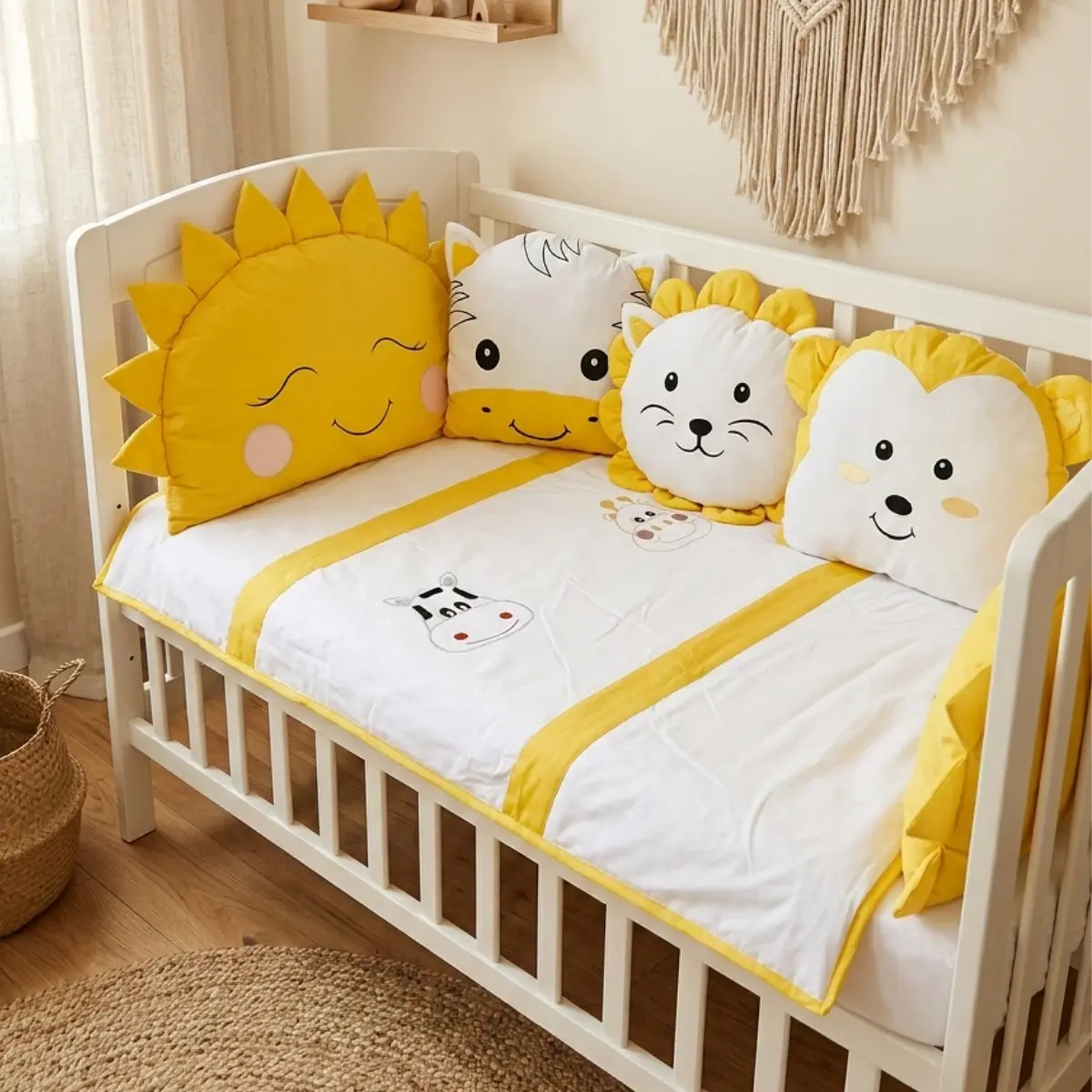 Animals bebek uyku seti; beyaz kumaş üzerine pembe, sarı, kahverengi ve mavi renklerdeki kumaşlar ile özenle kombinlenerek hazırlanmış, sevimli zürafa ve inek nakış işlemeli zarif bir safari temalı tasarımdır. Bebeğinizin odasına hem şıklık katar hem de sağlıklı bir uyku ortamı sunar.