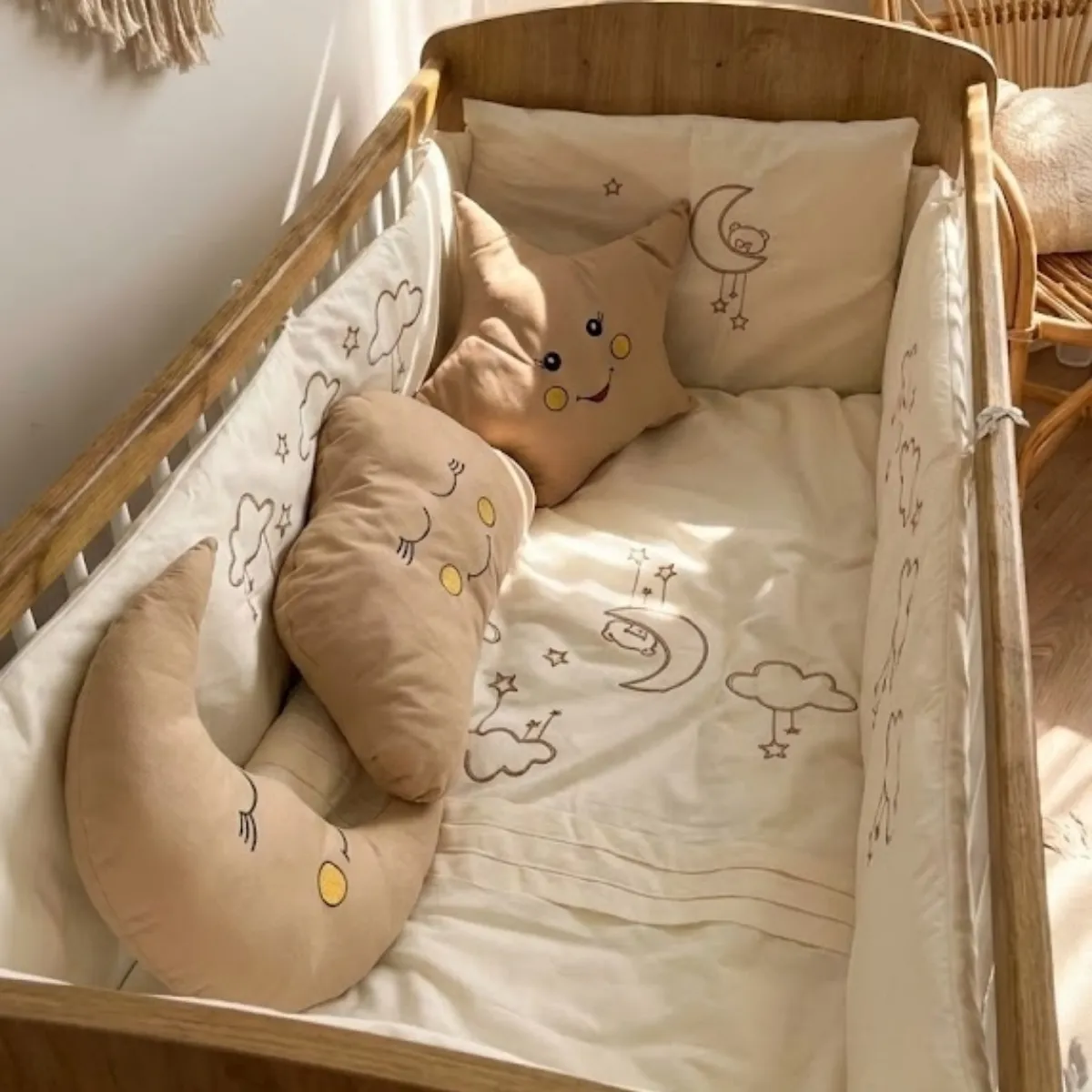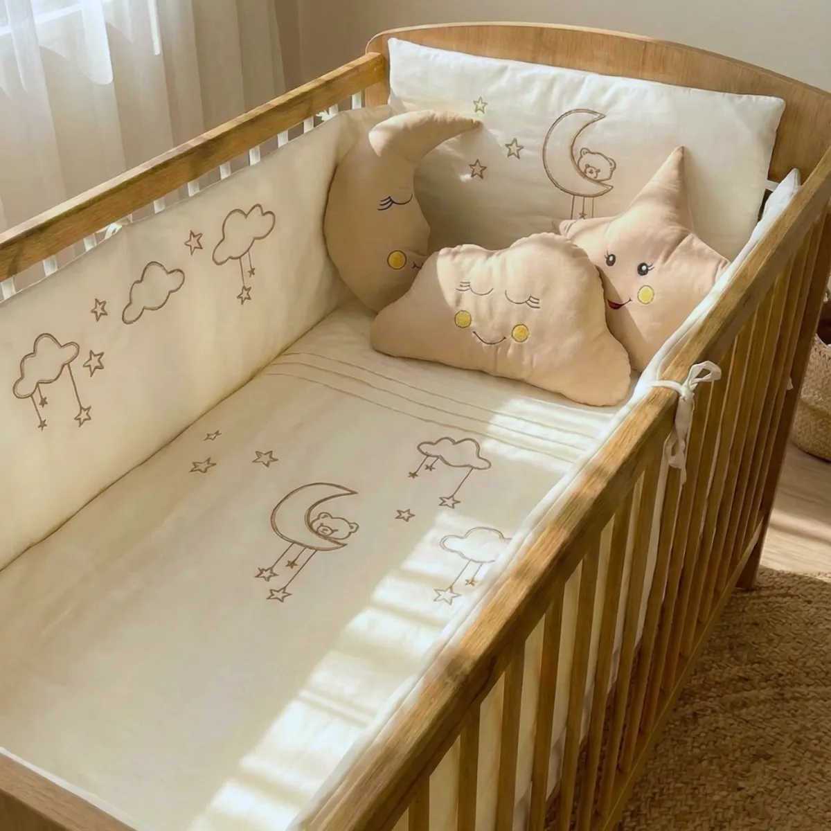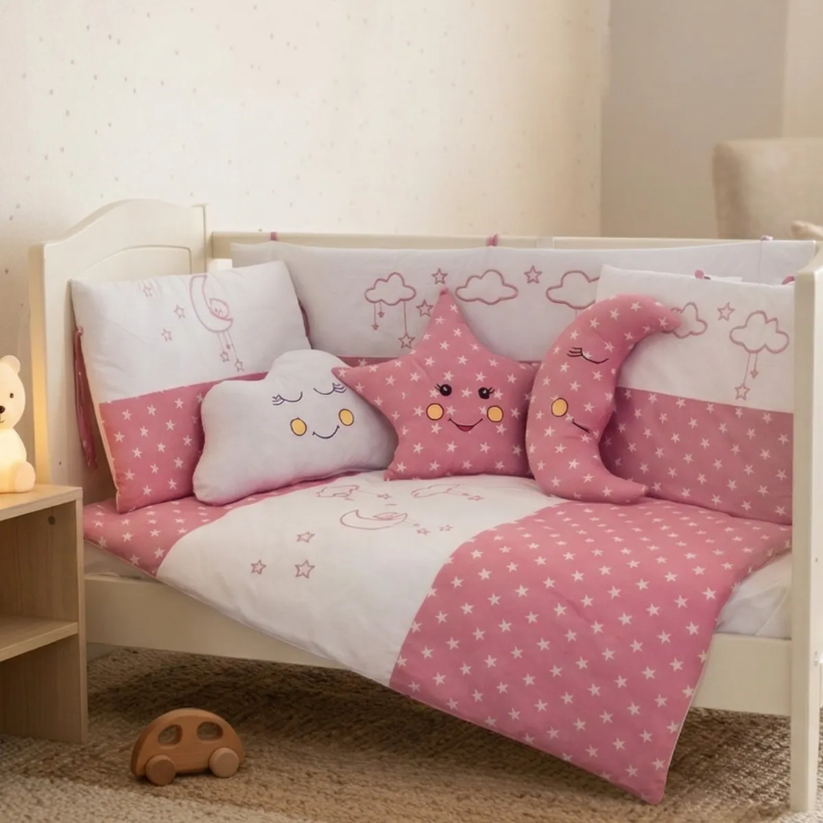%100 pamuklu kumaştan üretilen bebek uyku seti, Ayıcık ve bulut nakış işlemeleri ile huzurlu bir uyku ortamı sunar. Tüm nevresimler fermuarlıdır; iç elyafları kolayca çıkarılabilir. İç elyafları saran anti-bakteriyel kılıf sayesinde bebeğiniz elyaf tozlarına temas etmez.