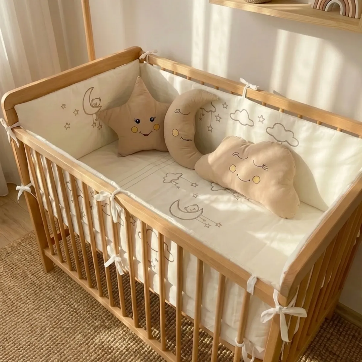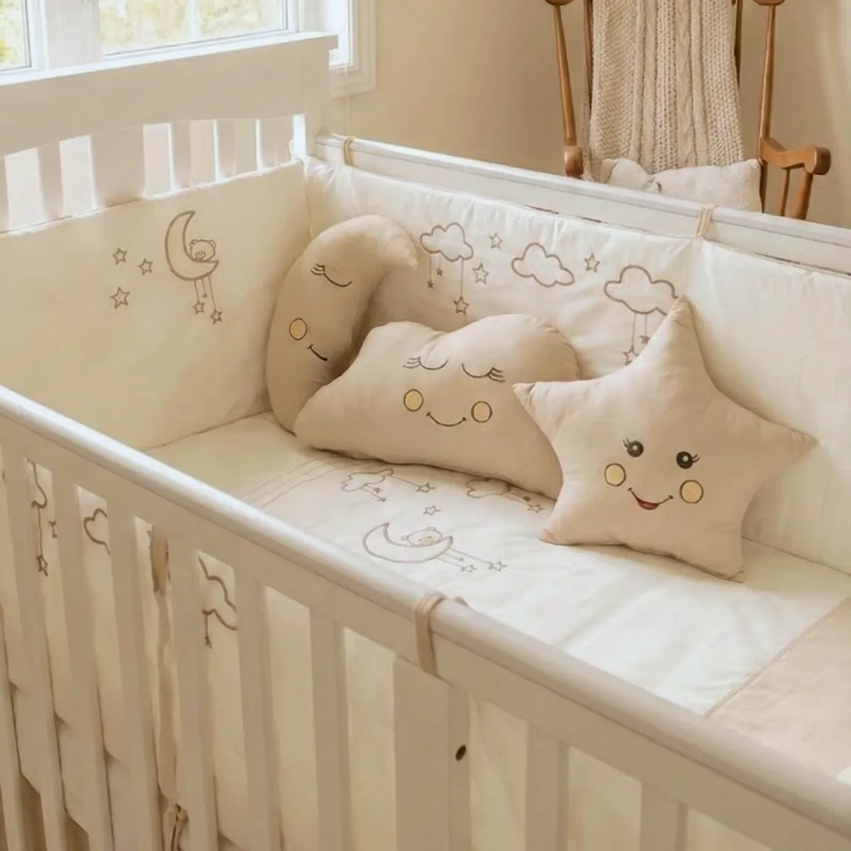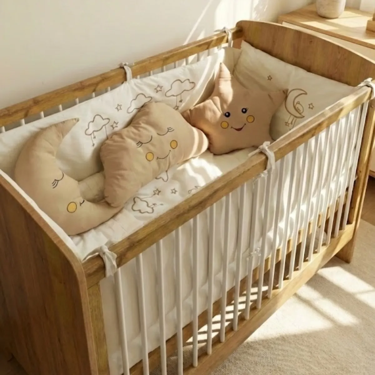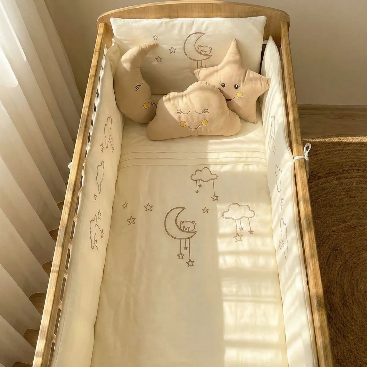 %100 pamuklu kumaştan üretilen bebek uyku seti, Ayıcık ve bulut nakış işlemeleri ile huzurlu bir uyku ortamı sunar. Tüm nevresimler fermuarlıdır; iç elyafları kolayca çıkarılabilir. İç elyafları saran anti-bakteriyel kılıf sayesinde bebeğiniz elyaf tozlarına temas etmez.