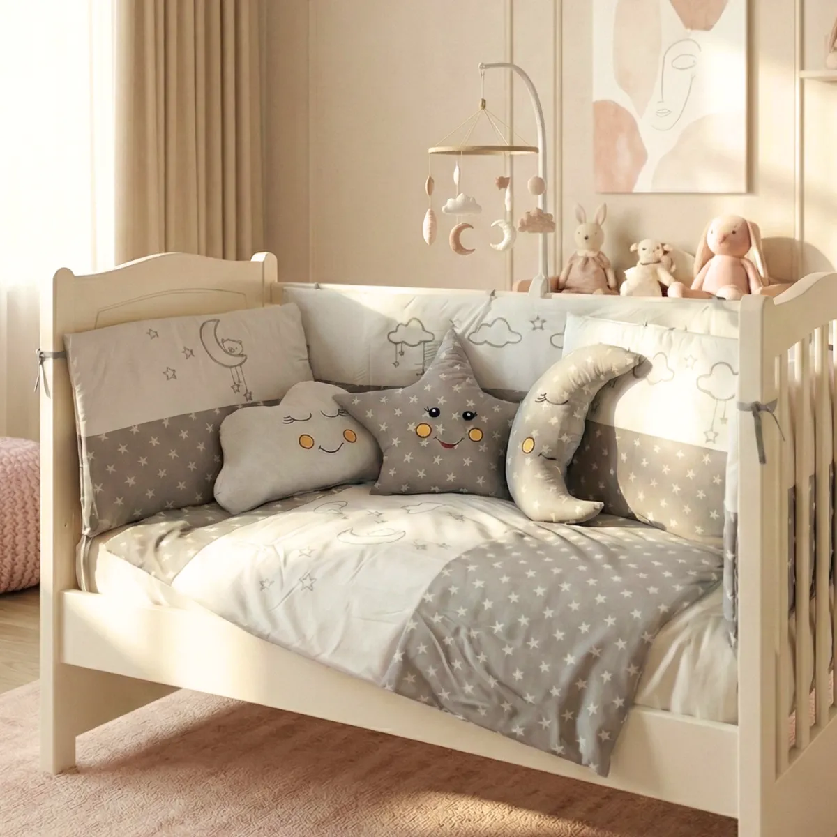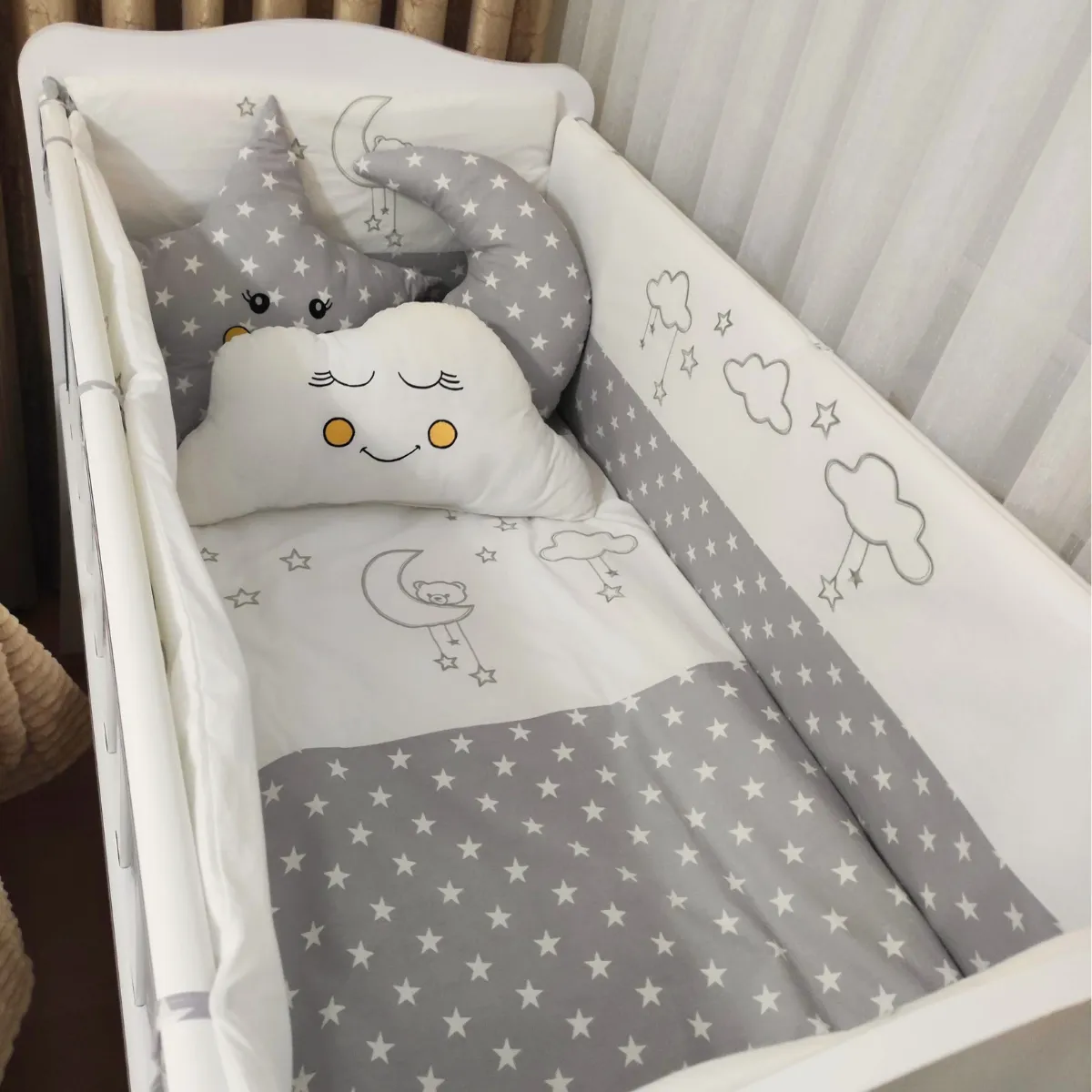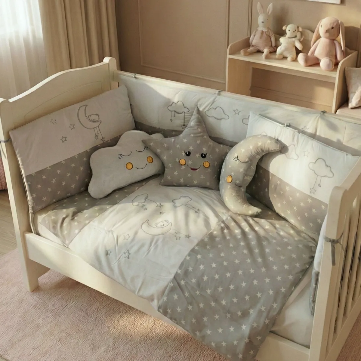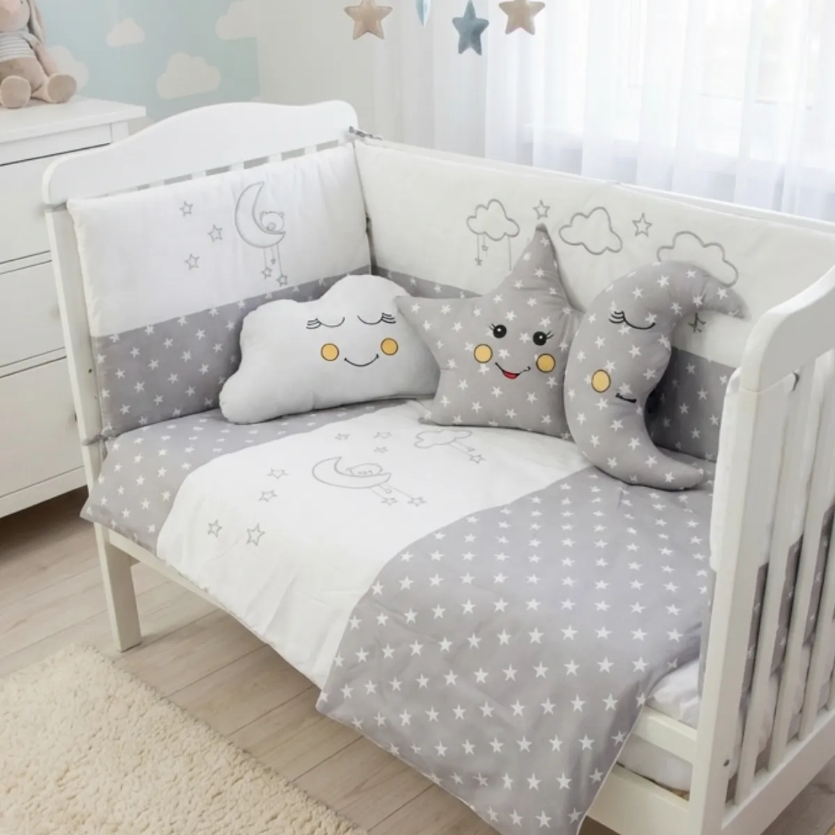 Cloudy bebek uyku seti; Gri, Gül Kurusu, Mavi ve Krem renk seçenekleriyle sunulmaktadır. Tüm beşik ölçüleriyle uyumludur.
