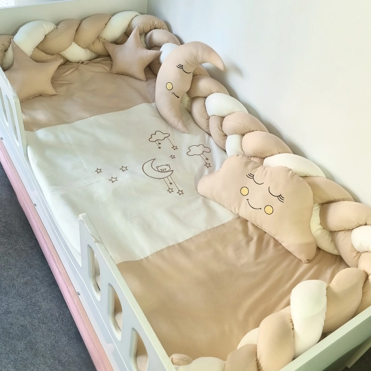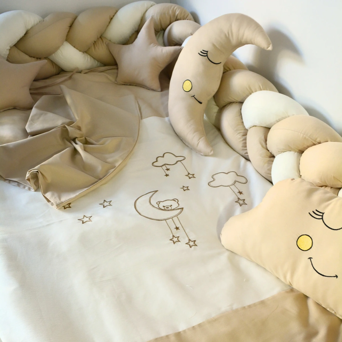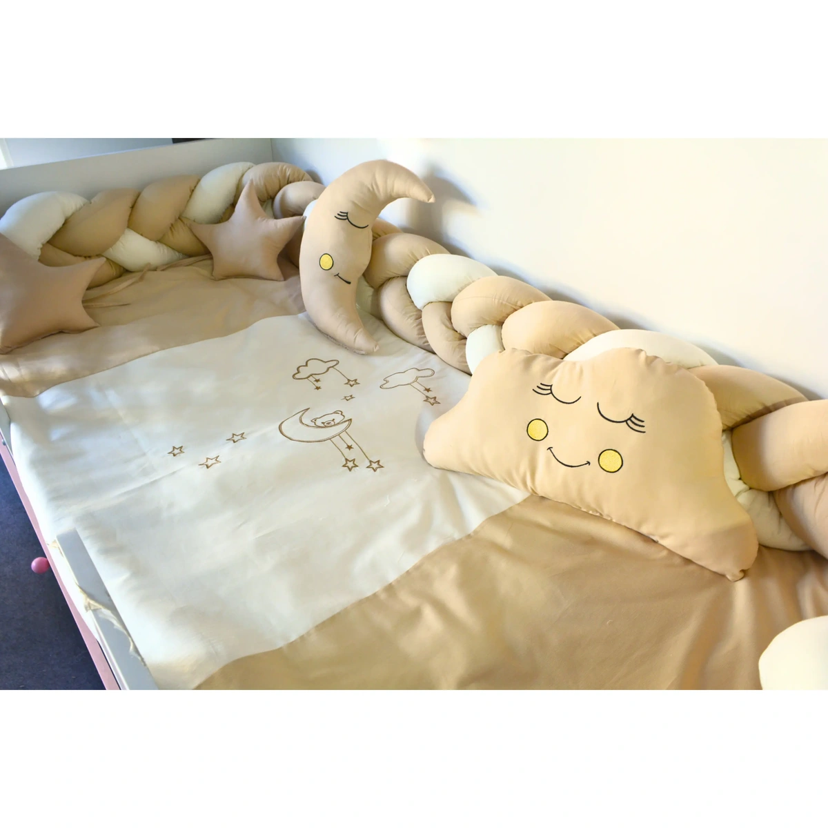 %100 pamuklu kumaştan üretilen montessori uyku seti, üzerinde nakış işleme olarak işlenmiş sevimli ayıcık, yıldızlar ve bulutların bulunduğu krem kumaş ve kahverengi renkteki kumaşlar ile kombinlenerek hazırlanmıştır.