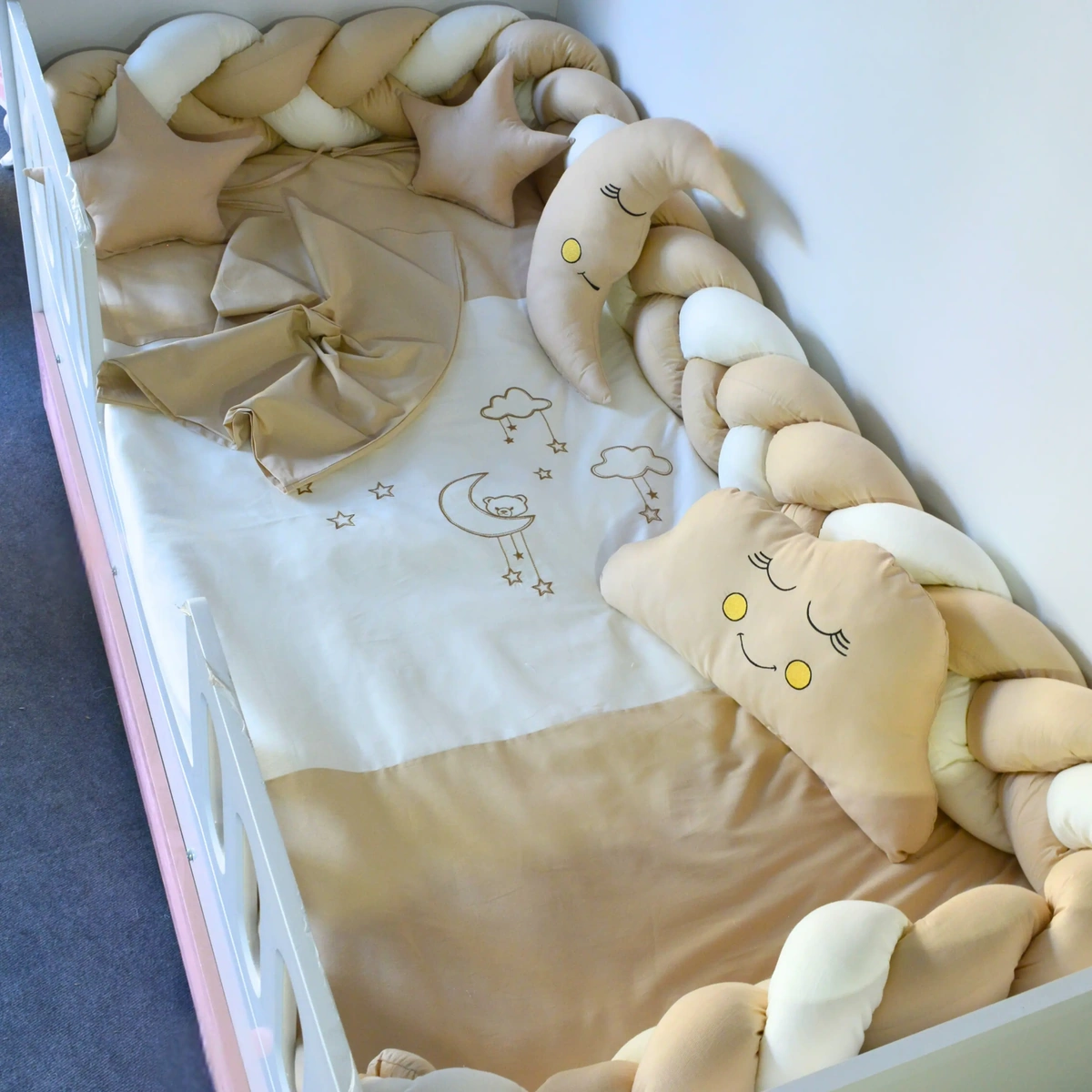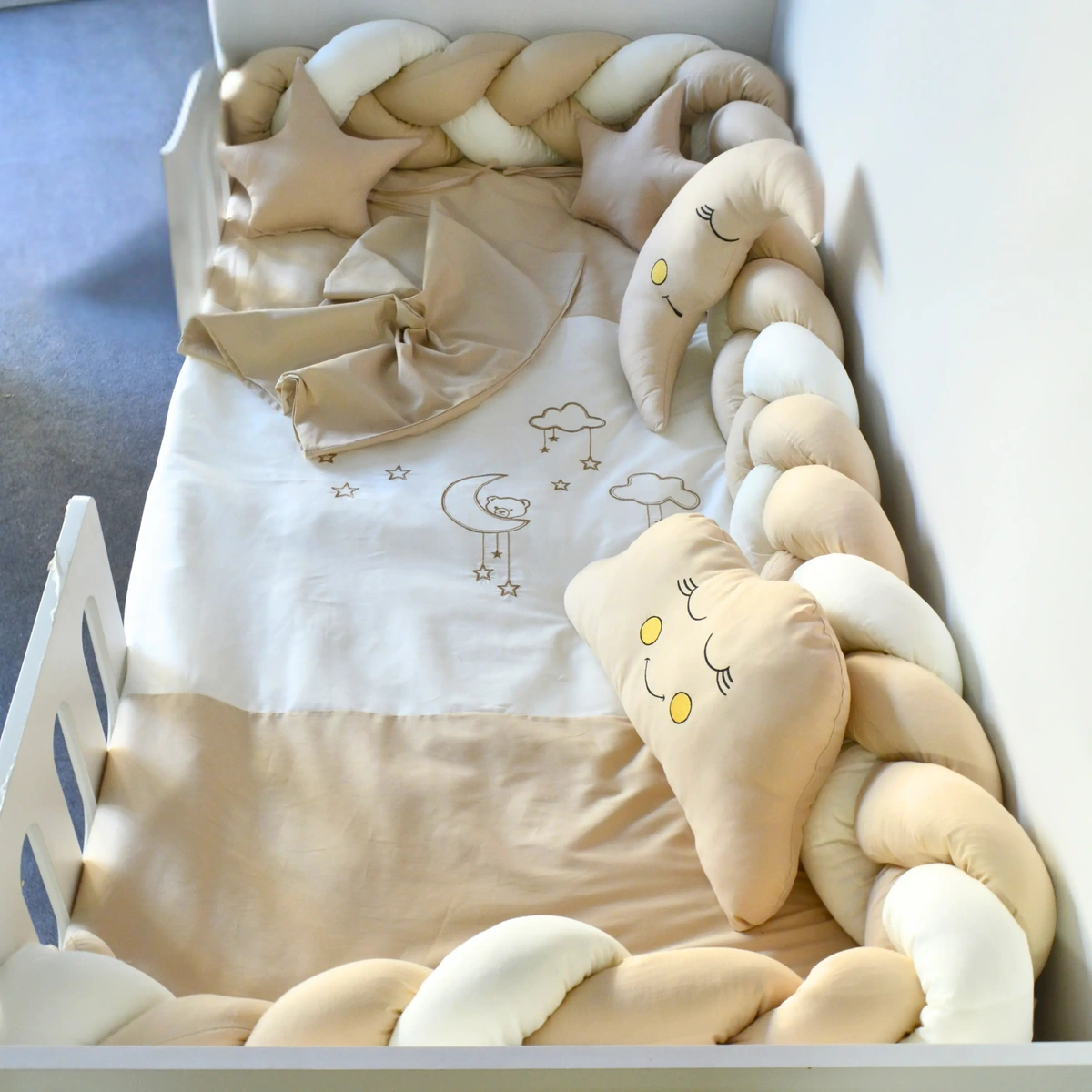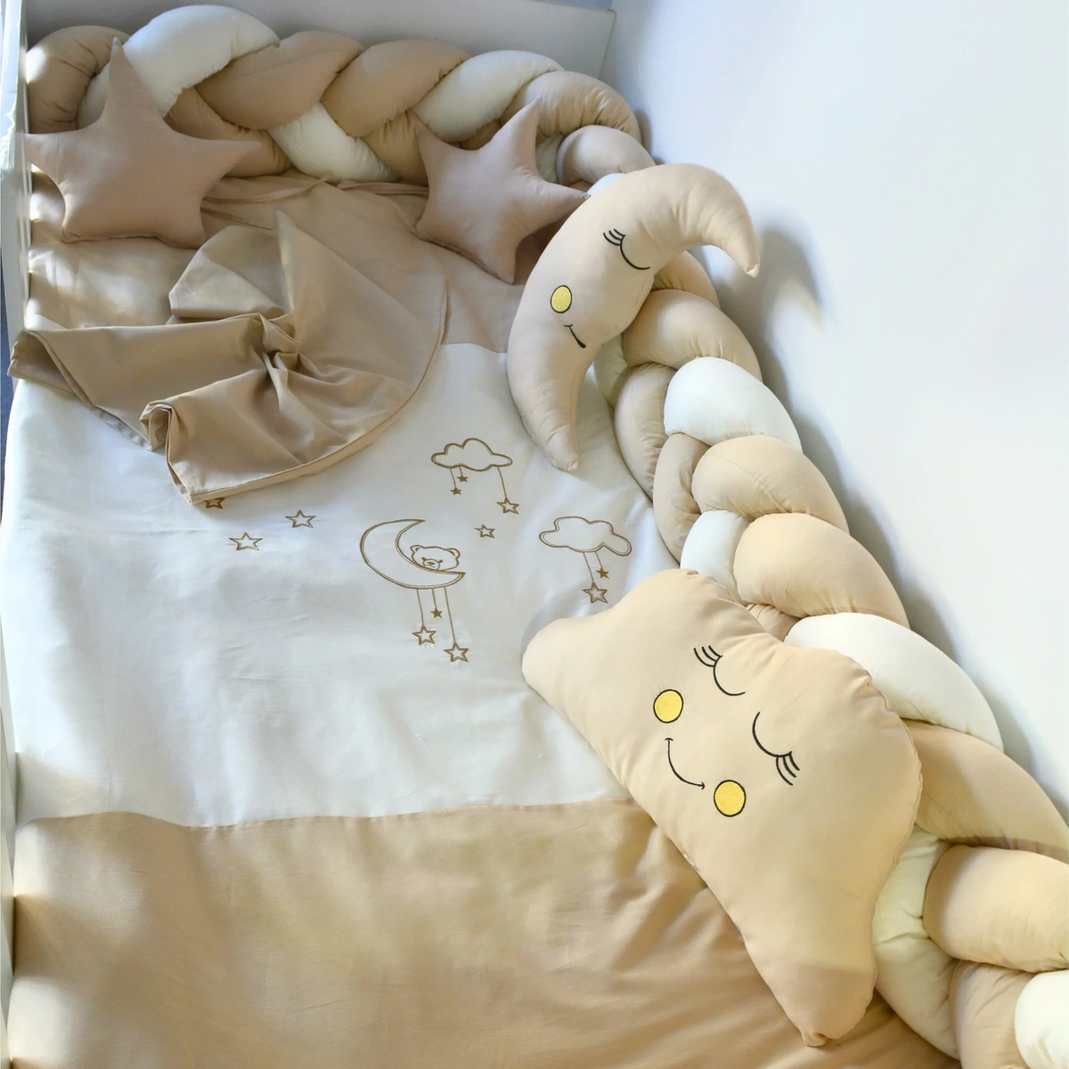 %100 pamuklu kumaştan üretilen montessori uyku seti, üzerinde nakış işleme olarak işlenmiş sevimli ayıcık, yıldızlar ve bulutların bulunduğu krem kumaş ve kahverengi renkteki kumaşlar ile kombinlenerek hazırlanmıştır.
