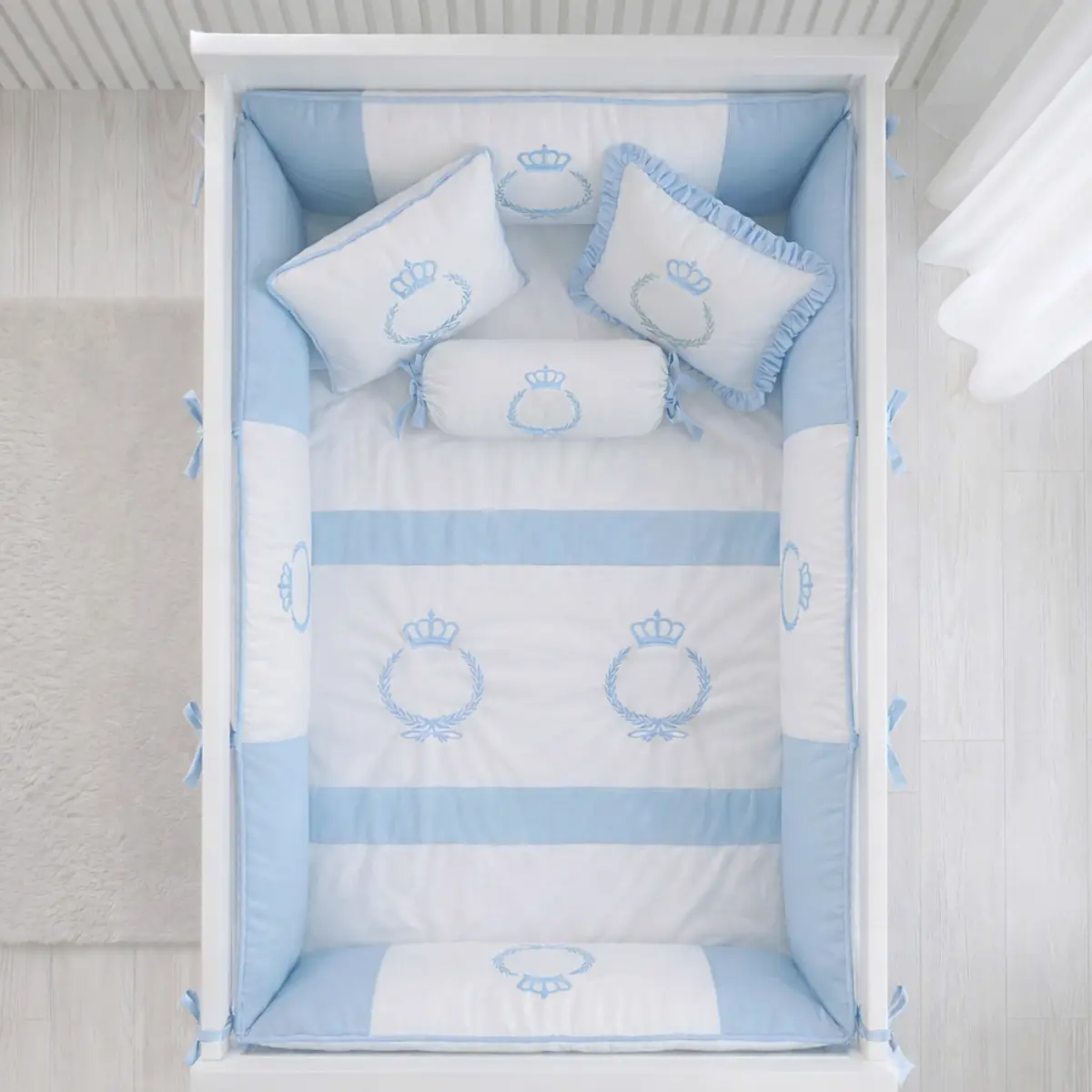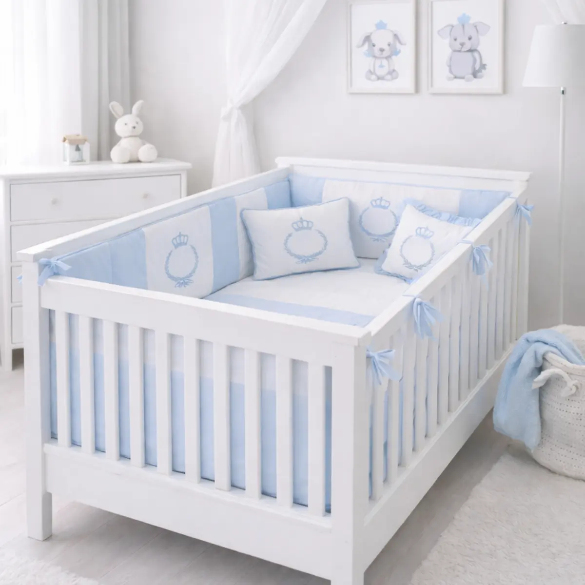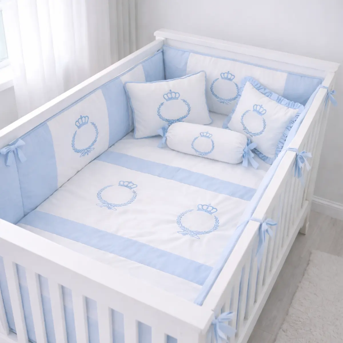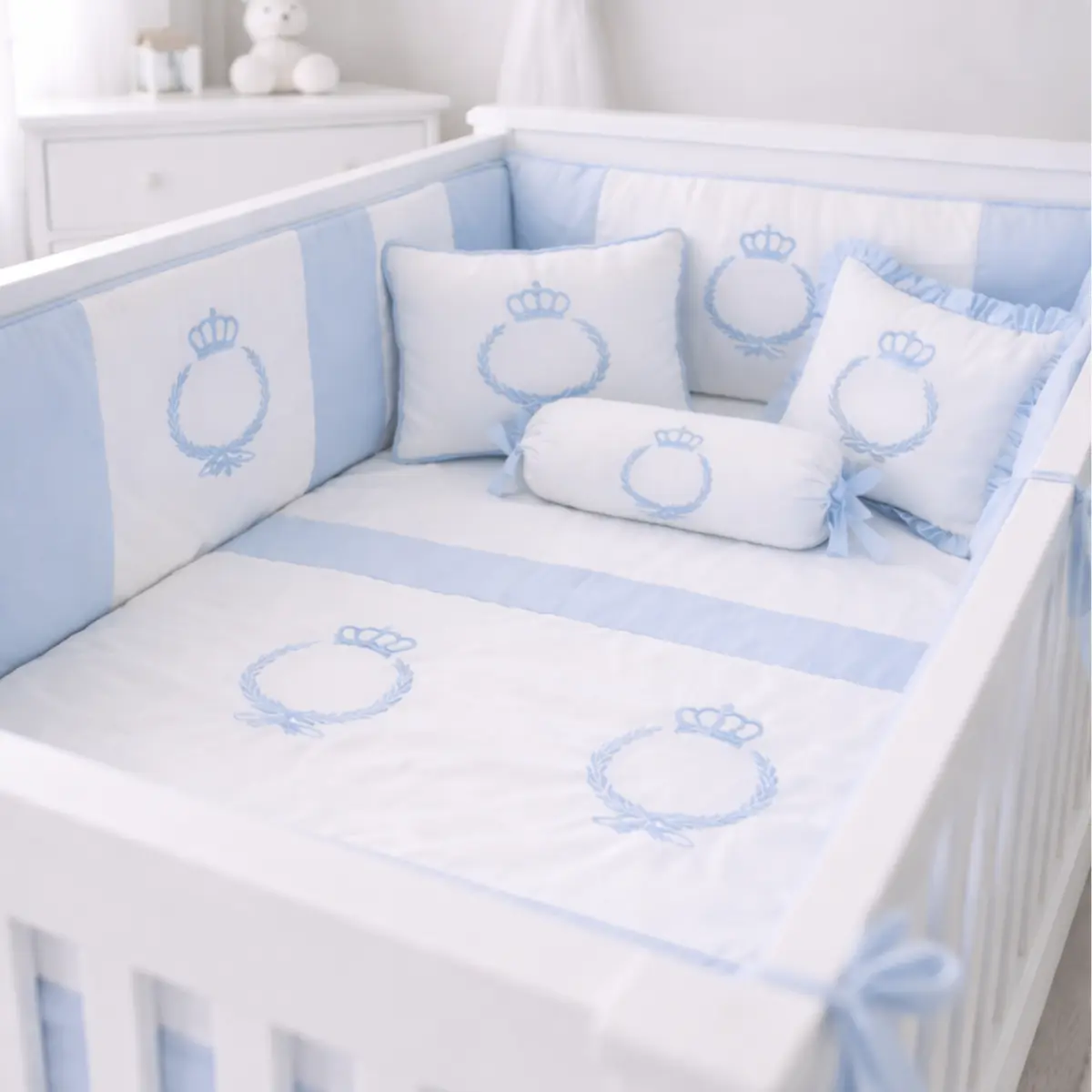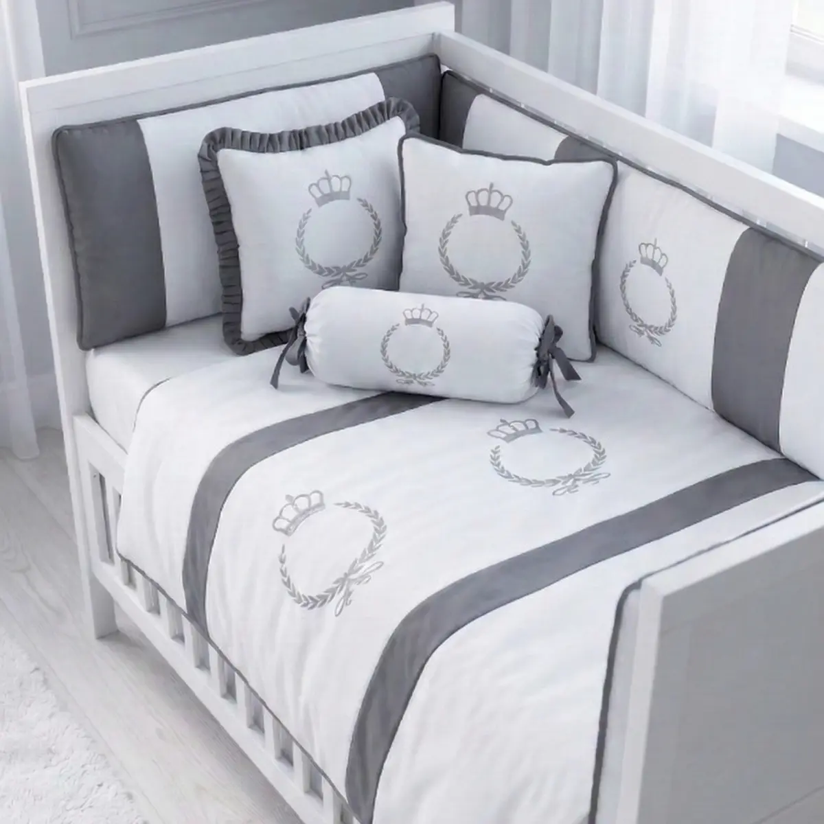 Crown bebek uyku seti, beyaz kumaş üzerine gri ve mavi renklerdeki kumaşlar ile kombinlenerek hazırlanmış, zarif taç nakış işlemeli asil bir tasarımdır.