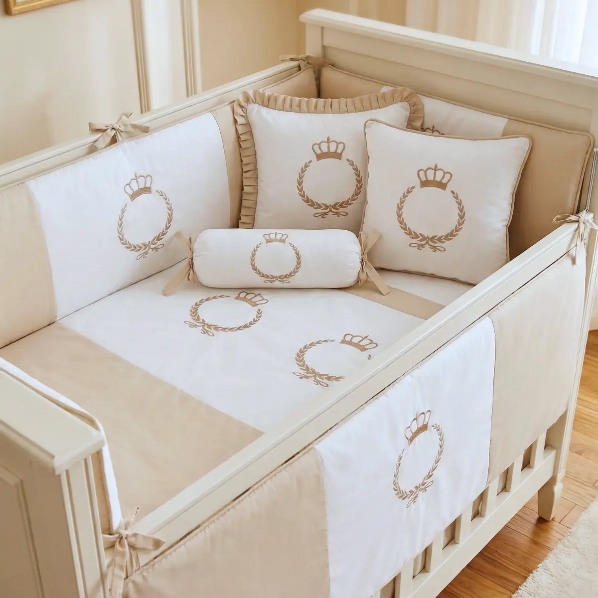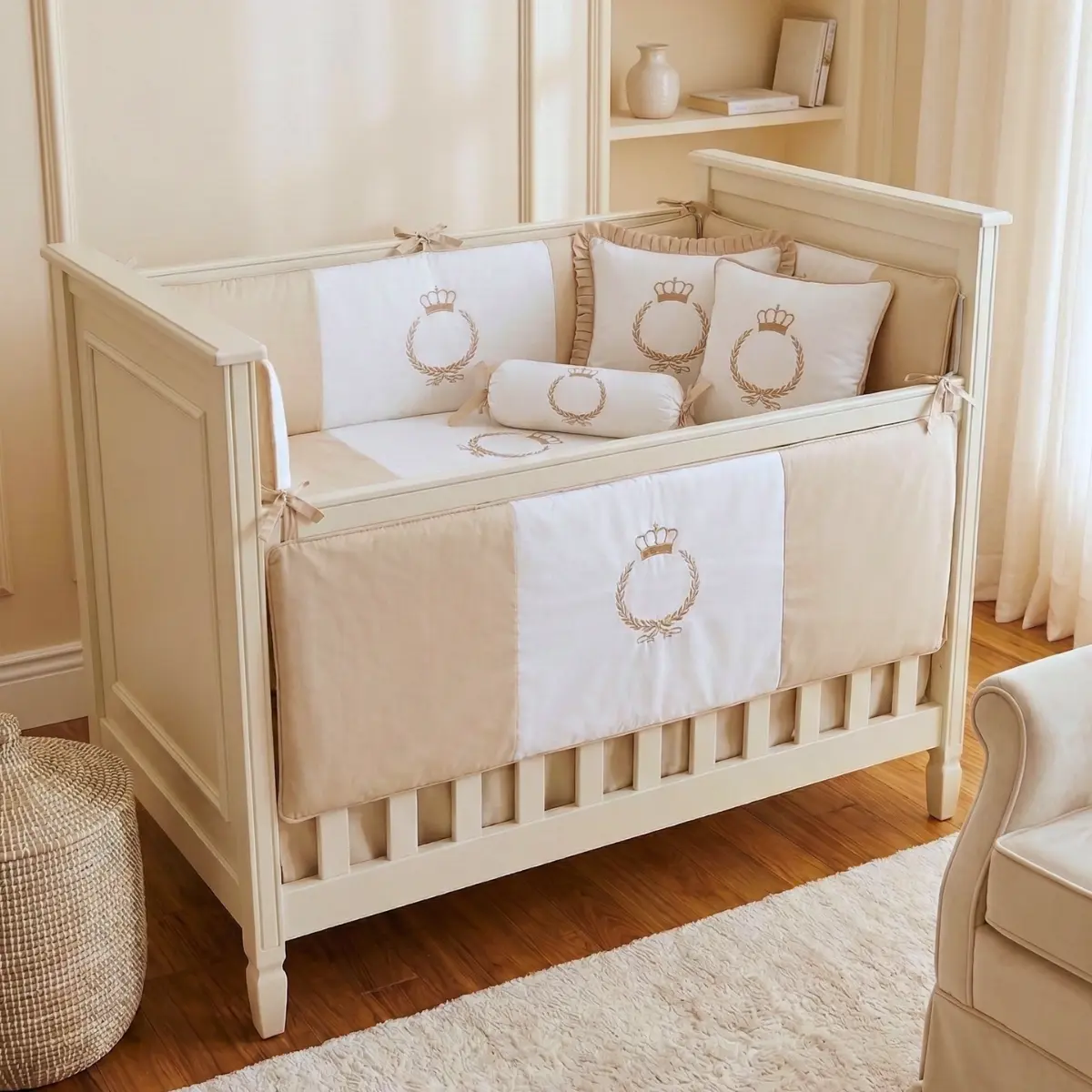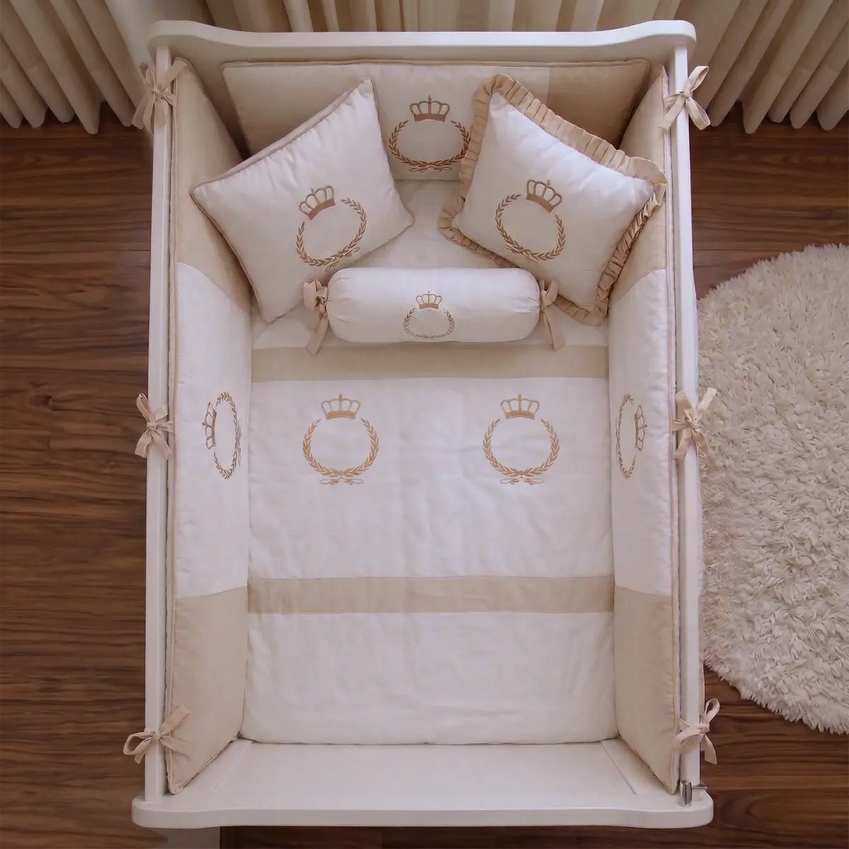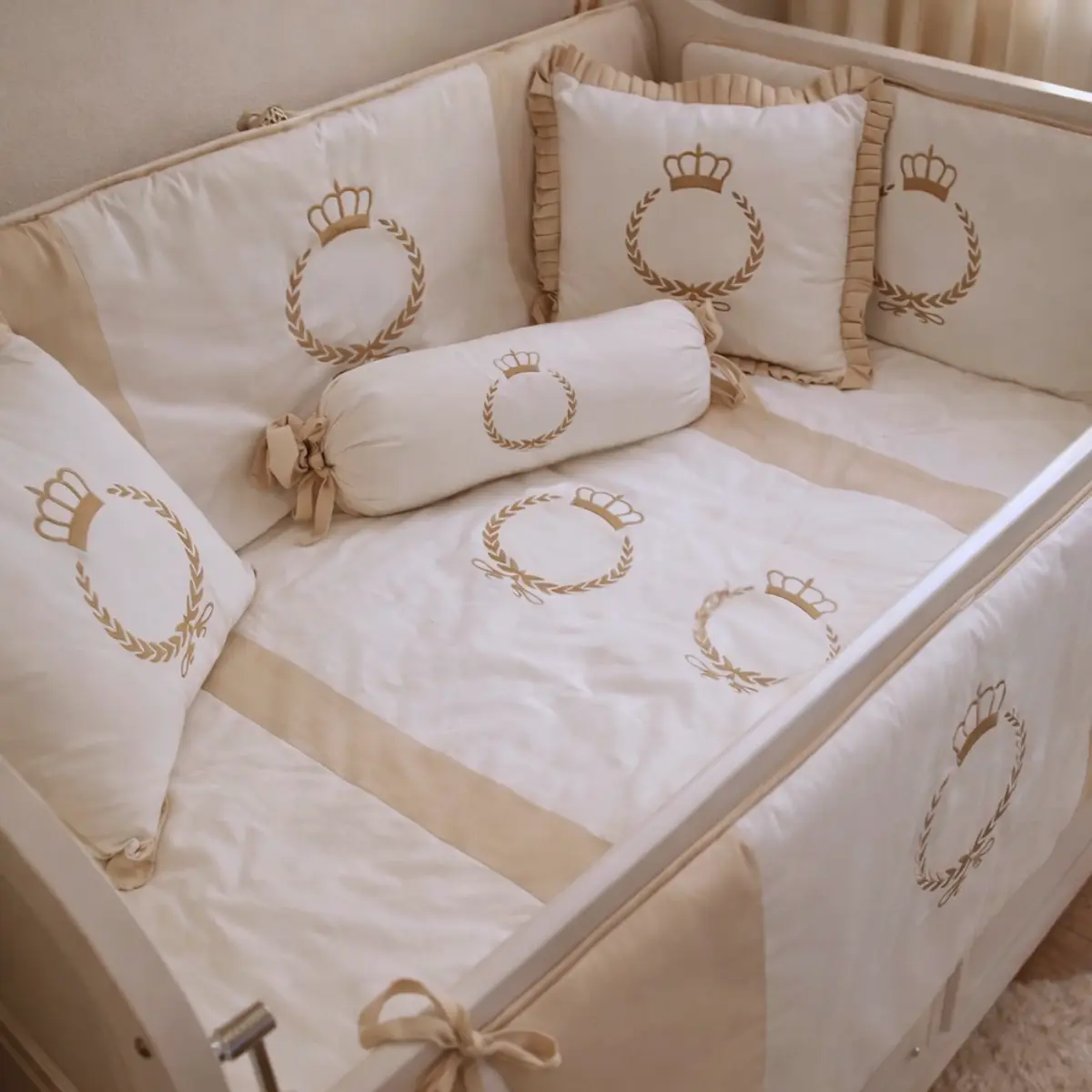 %100 pamuklu kumaştan üretilen bebek uyku seti, Taç nakış işlemesi ile zarif ve asil bir görünüm sunar. Tüm nevresimler fermuarlıdır; iç elyafları kolayca çıkarılabilir. İç elyafları saran anti-bakteriyel kılıf sayesinde bebeğiniz elyaf tozlarına temas etmez.