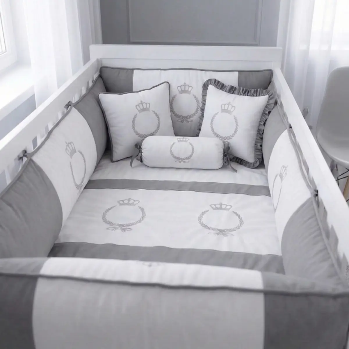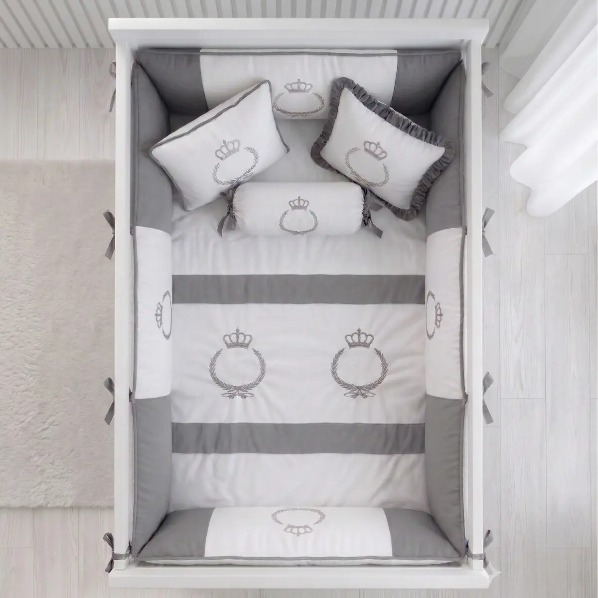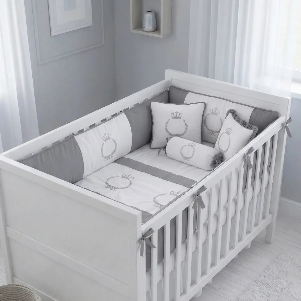 Crown bebek uyku seti; Gri ve Mavi renk seçenekleriyle sunulmaktadır. Tüm beşik ölçüleriyle uyumludur.