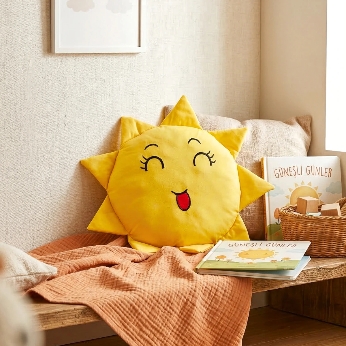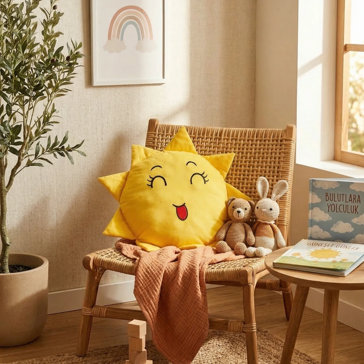 Güneş teması, sarı ve turuncu tonlarıyla neşeli ve sıcak bir bebek odası atmosferi oluşturur. Bu yastığı beşiğin köşesine, oyun matına veya oda dekorasyonunun odak noktasına yerleştirebilirsiniz.