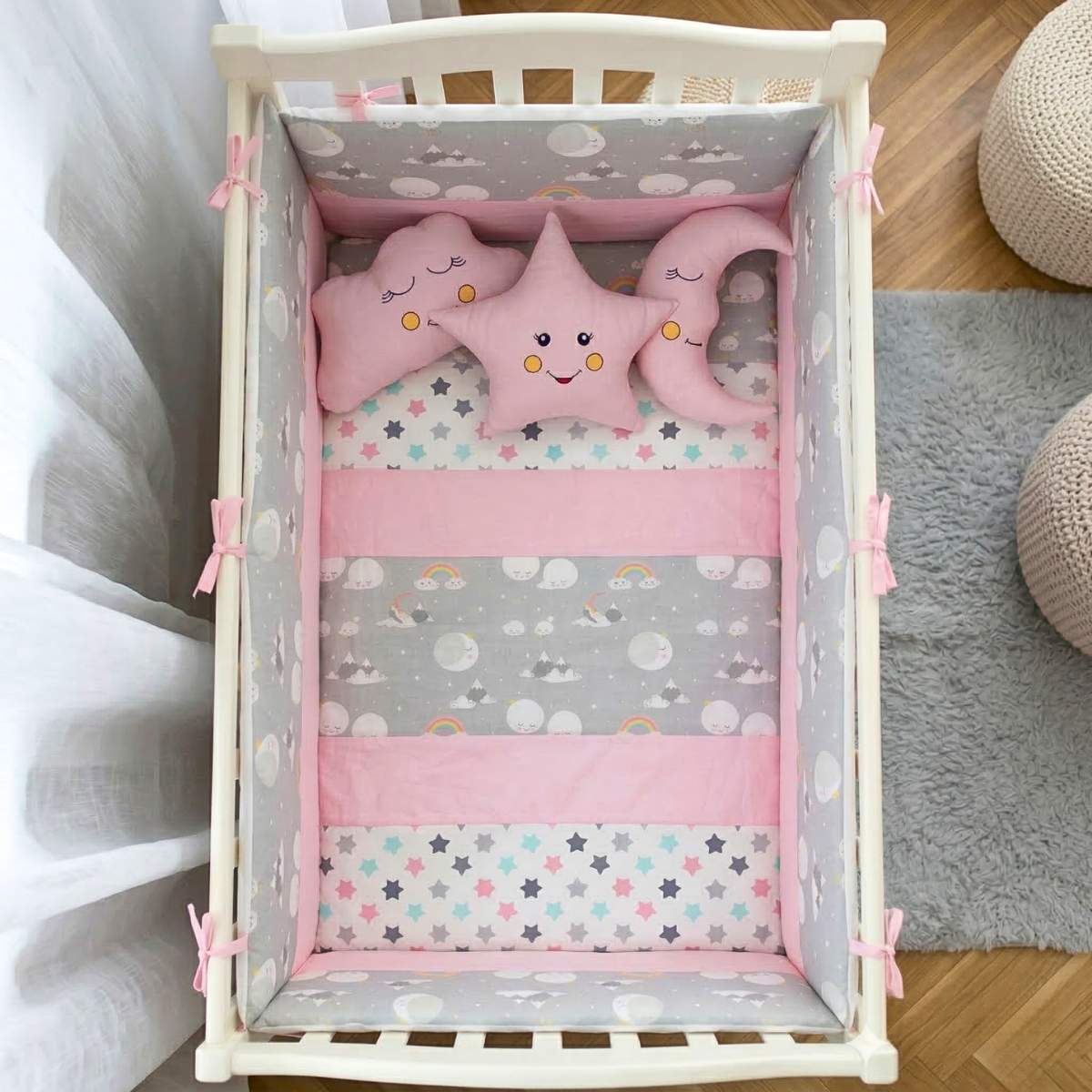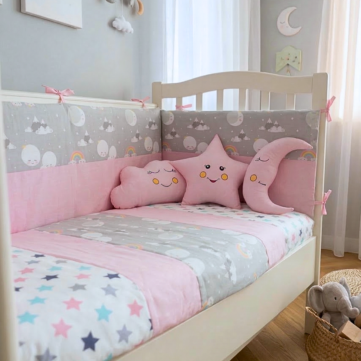 Mountain bebek uyku seti, buz dağı desenli açık gri kumaş ve renkli yıldızlı kumaş üzerine pembe kumaş ile kombinlenerek hazırlanmış doğa temalı bir tasarımdır.
