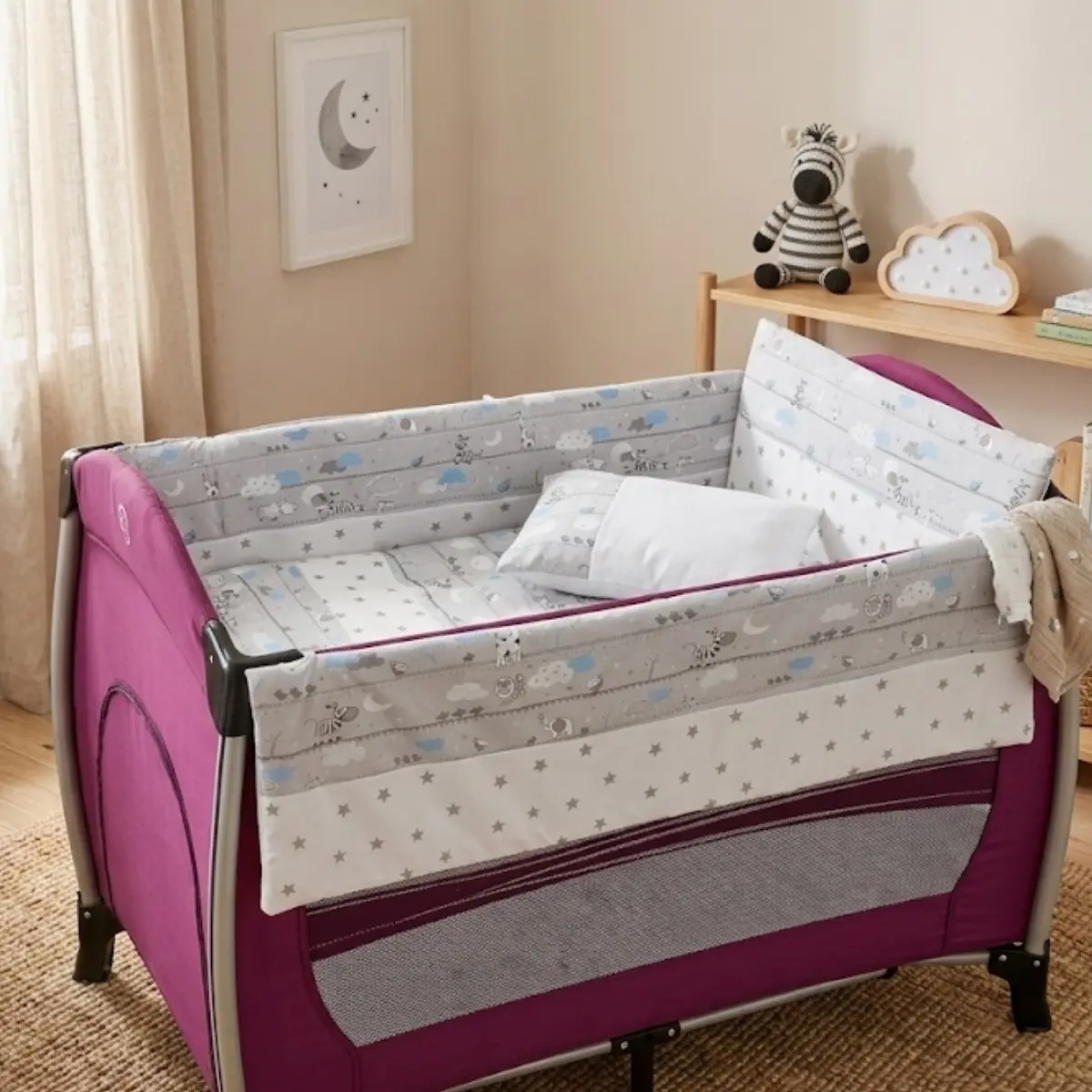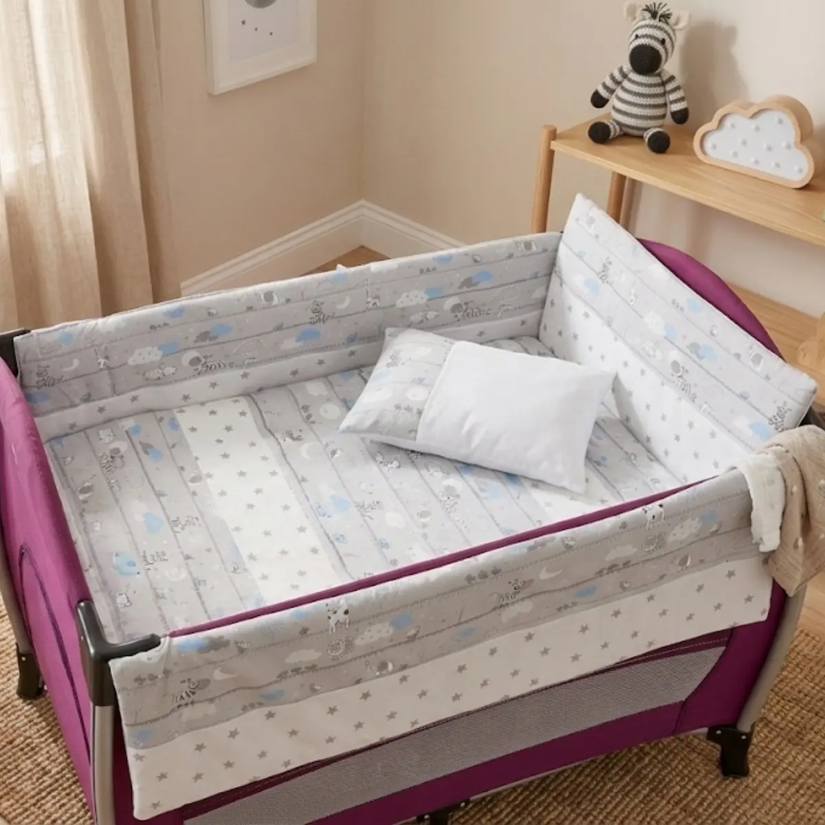 %100 pamuklu kumaştan üretilen oyun parkı bebek uyku seti, yanmaz ve anti-alerjik elyaf kullanılarak hazırlanmıştır. Yan ve baş korumaları sayesinde bebeğiniz güvenle uyuyabilir. Bebeğinizin yatağında güvenli uyumasını sağlar.