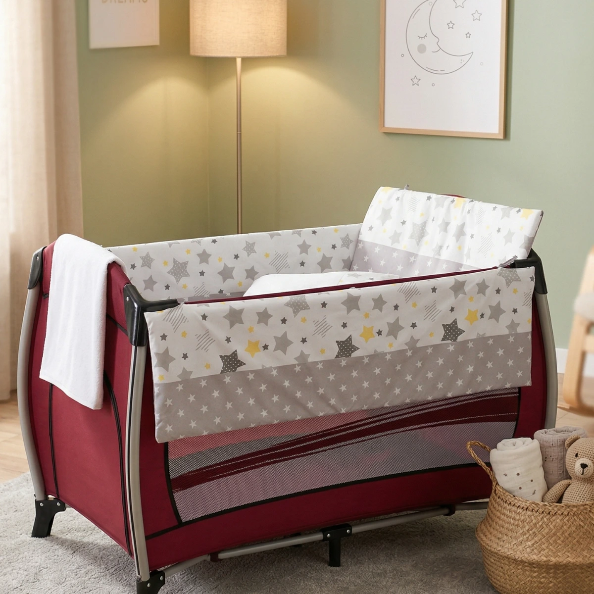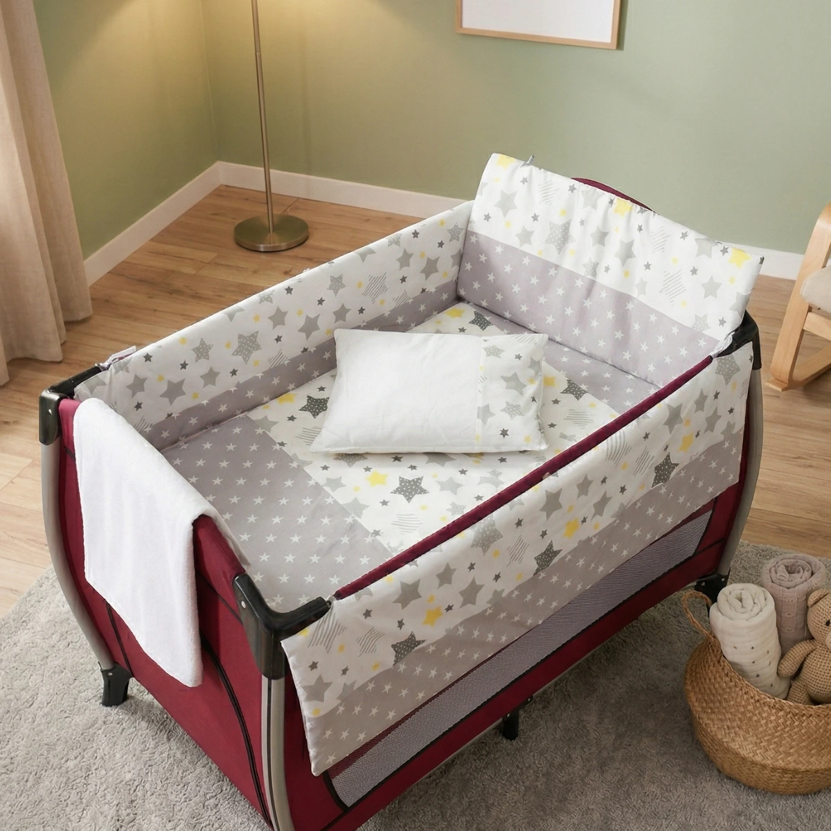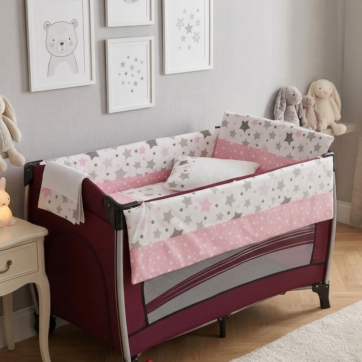 %100 pamuklu kumaştan üretilen oyun parkı bebek uyku seti, yanmaz ve anti-alerjik elyaf kullanılarak hazırlanmıştır. Yan ve baş korumaları sayesinde bebeğiniz güvenle uyuyabilir.