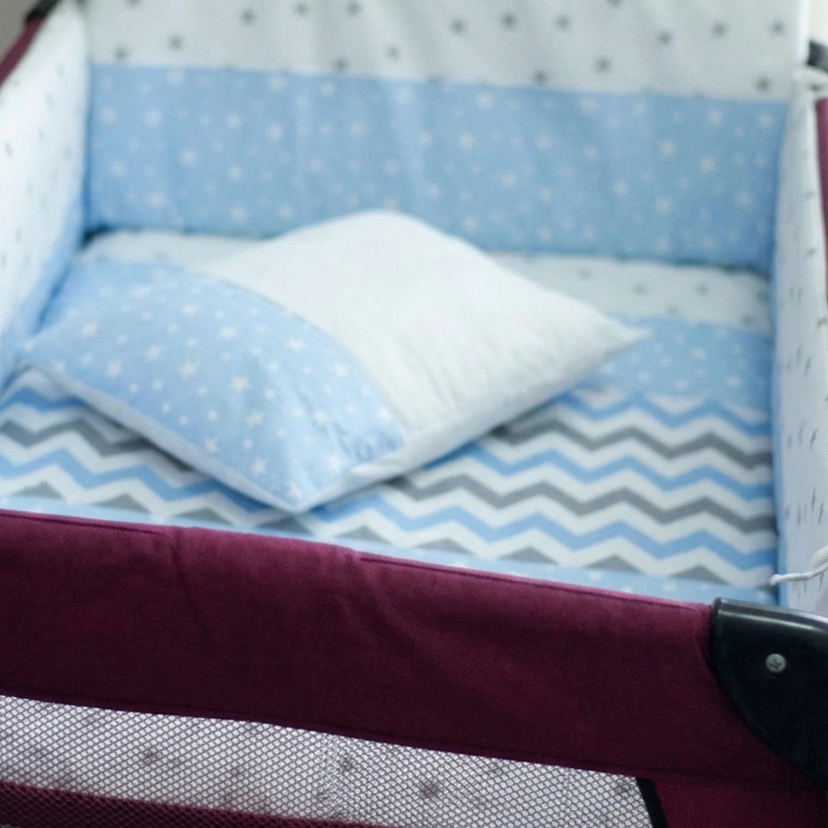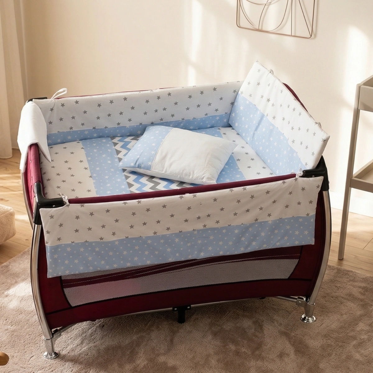 %100 pamuklu kumaştan üretilen oyun parkı bebek uyku seti, yanmaz ve anti-alerjik elyaf kullanılarak hazırlanmıştır. Yan ve baş korumaları sayesinde bebeğiniz güvenle uyuyabilir.