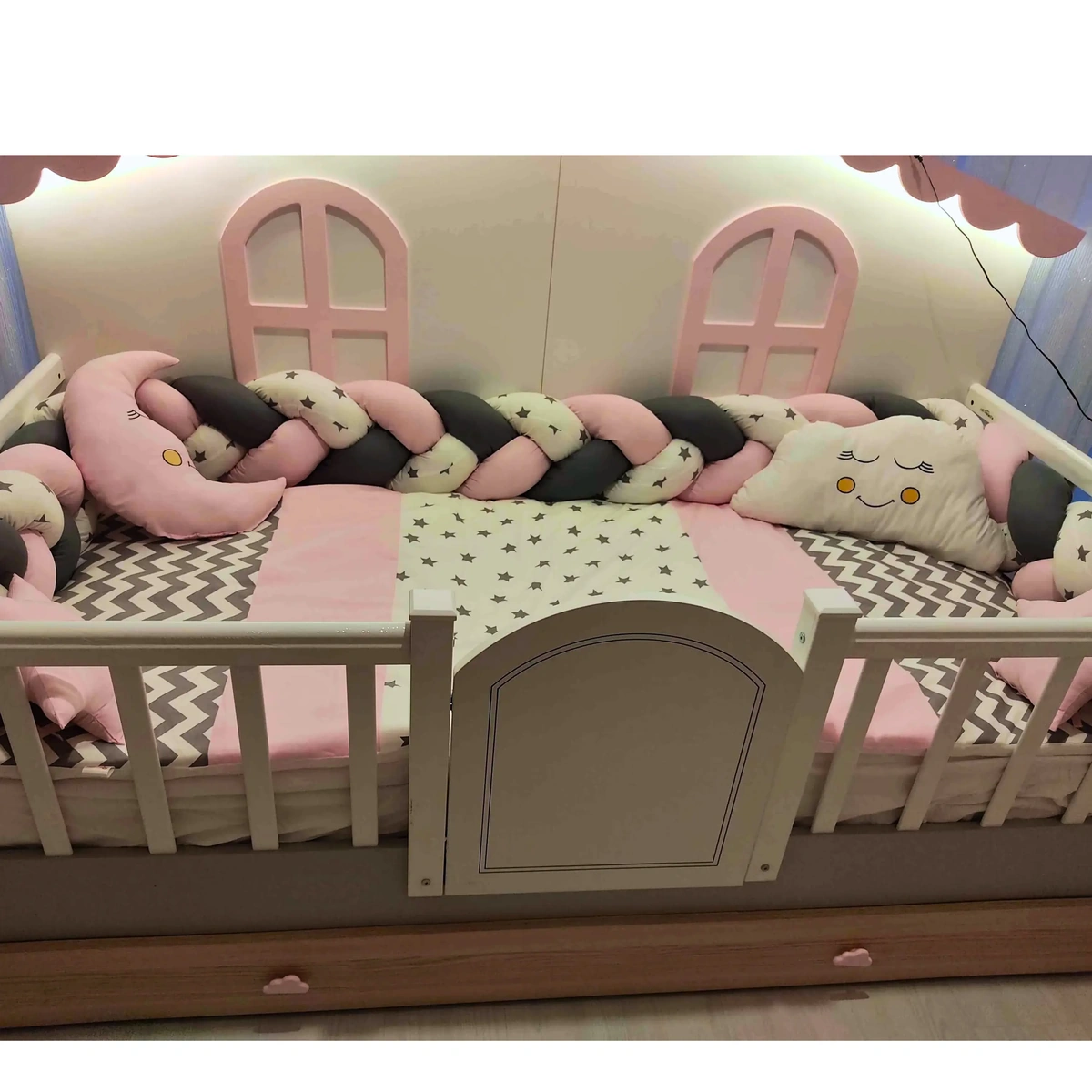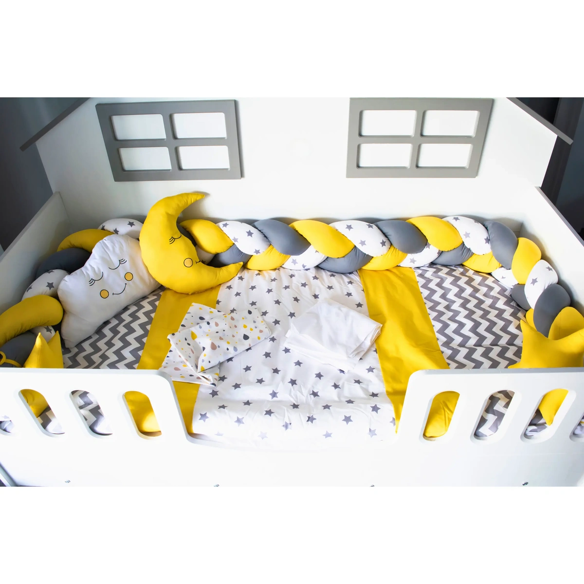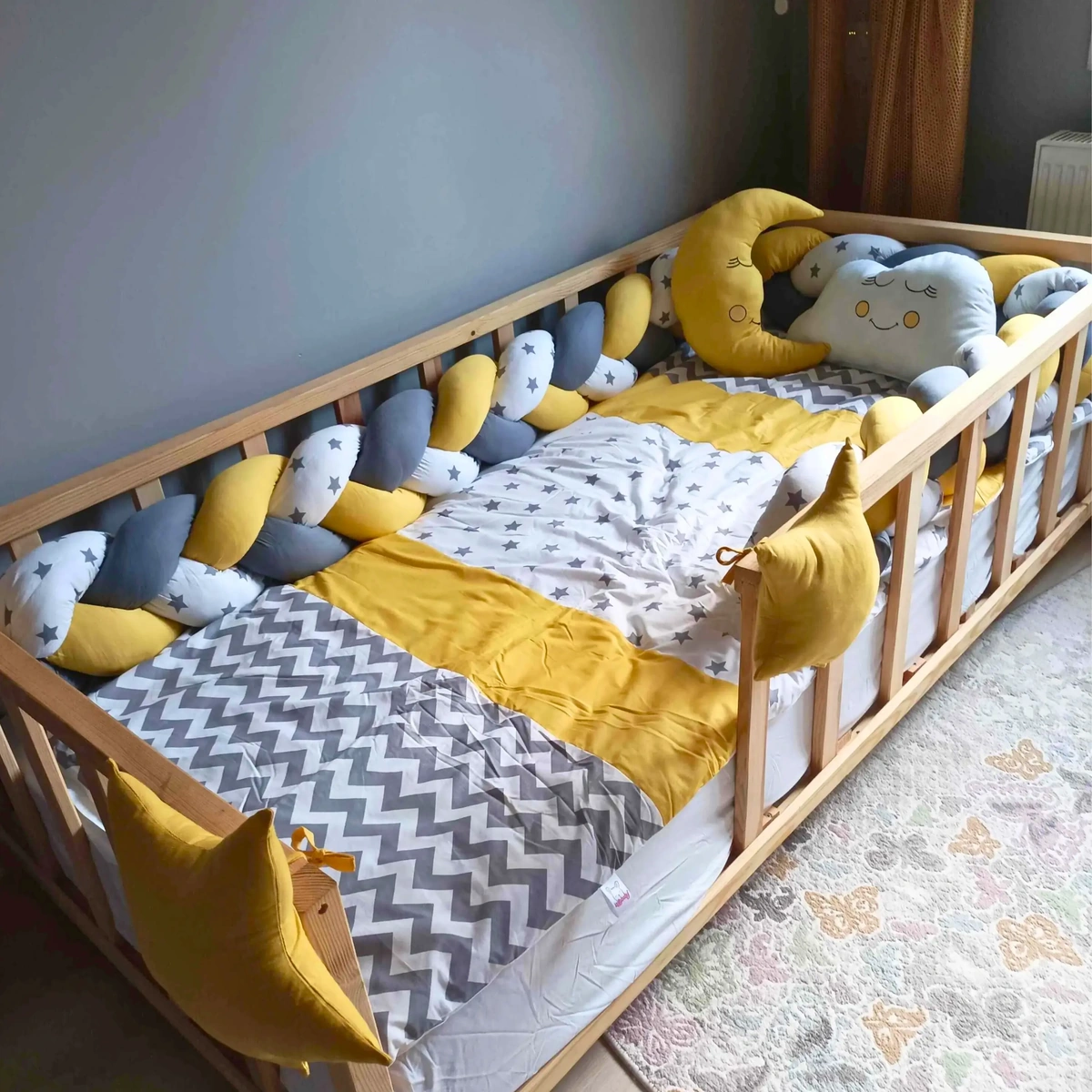 Yan örgü korumalarında gri, seçtiğiniz renk ve beyaz üzerine gri yıldızlı kumaş kullanılmıştır. Örgü yan korumalar 35 cm olup oldukça dolgundur. Montessori uyku setindeki tüm nevresimler fermuarlıdır; iç elyafları kolayca çıkarılabilir.