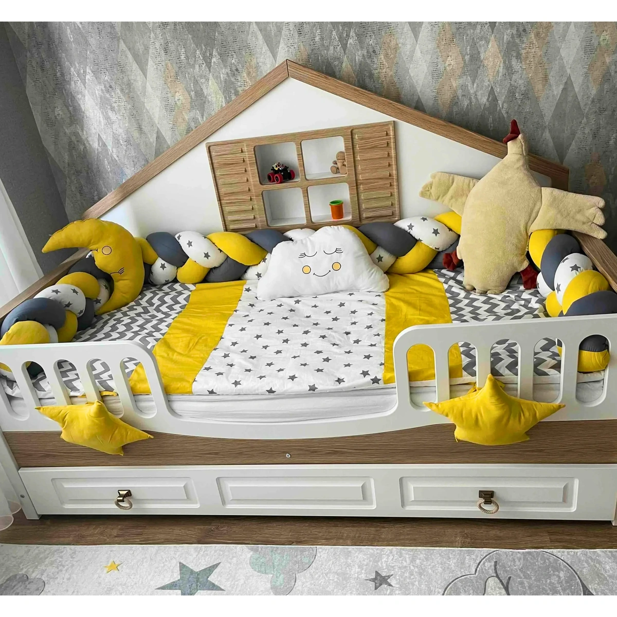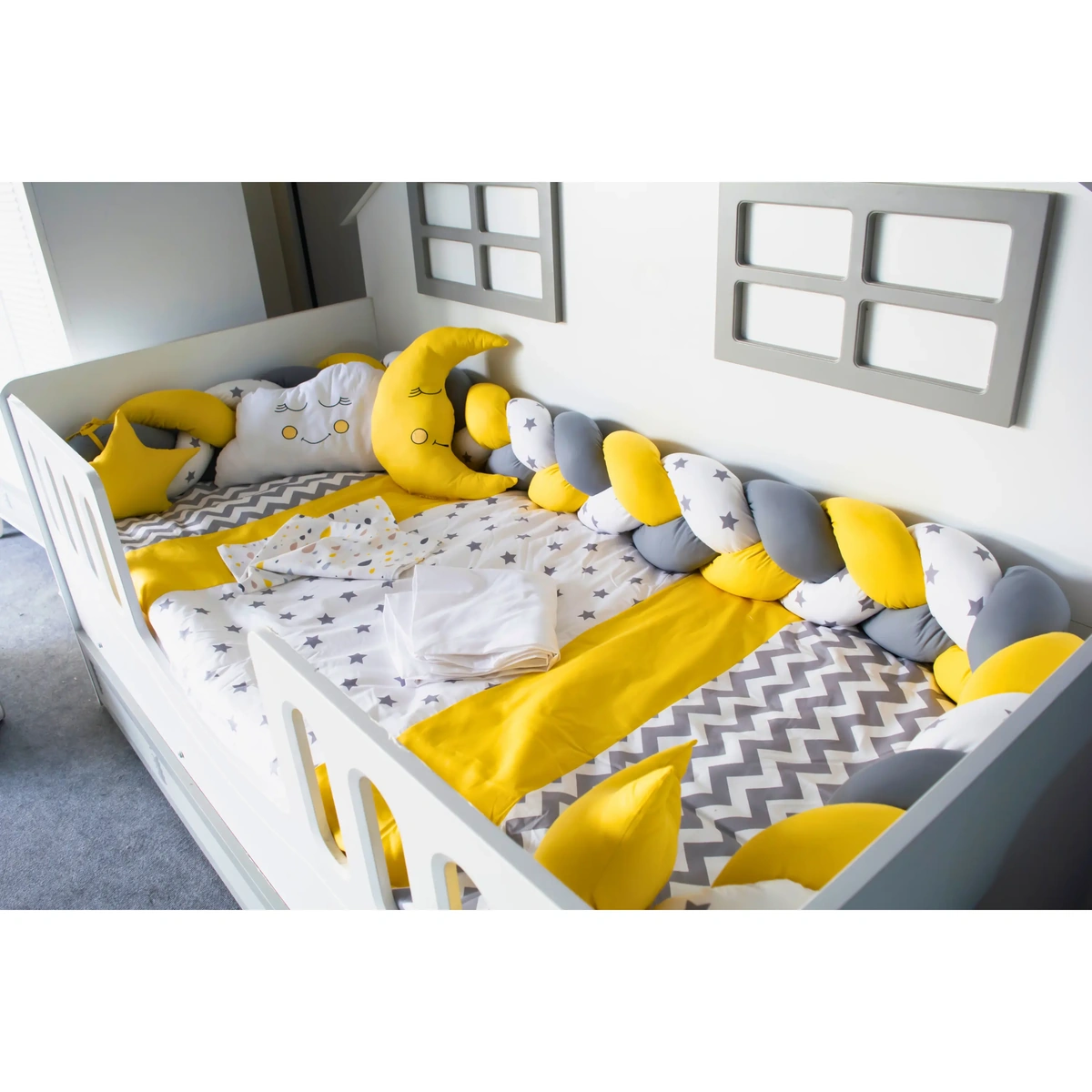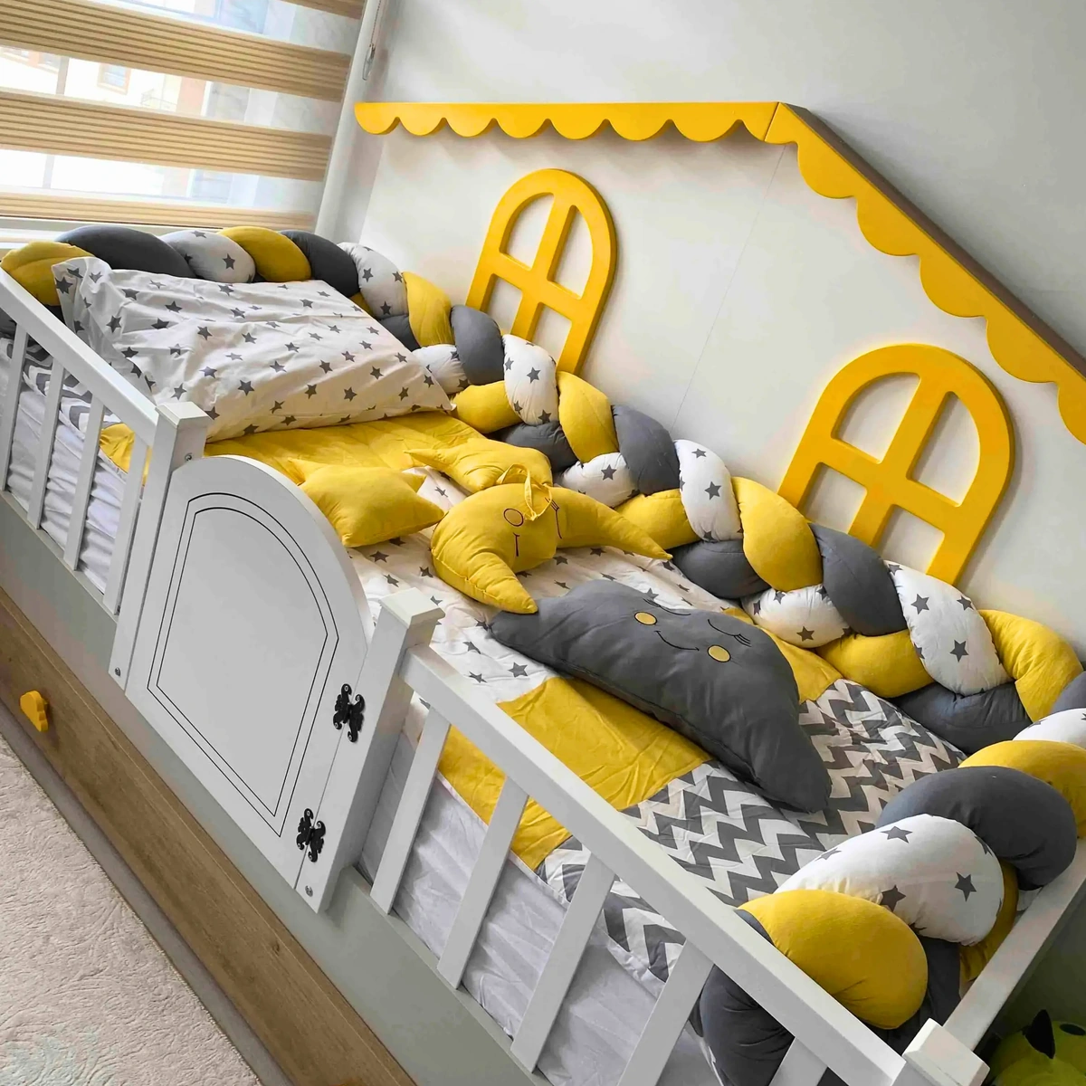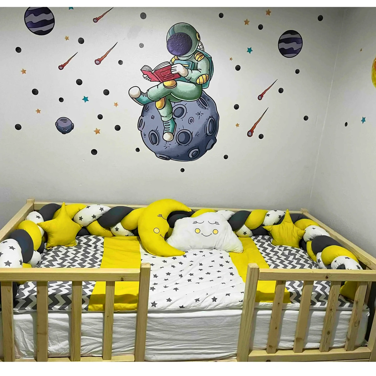 Yan örgü korumalarında gri, seçtiğiniz renk ve beyaz üzerine gri yıldızlı kumaş kullanılmıştır. Örgü yan korumalar 35 cm olup oldukça dolgundur. Montessori uyku setindeki tüm nevresimler fermuarlıdır; iç elyafları kolayca çıkarılabilir.