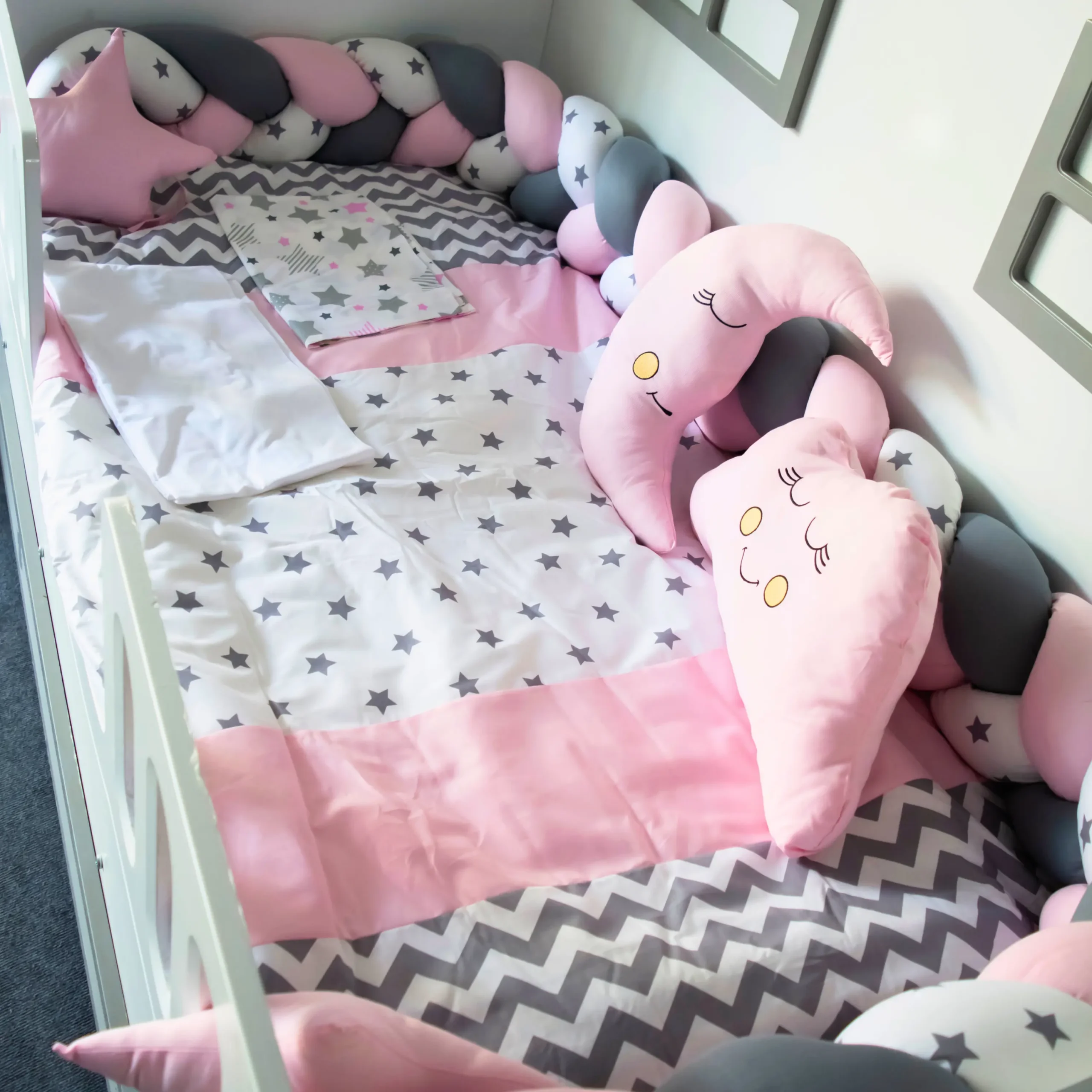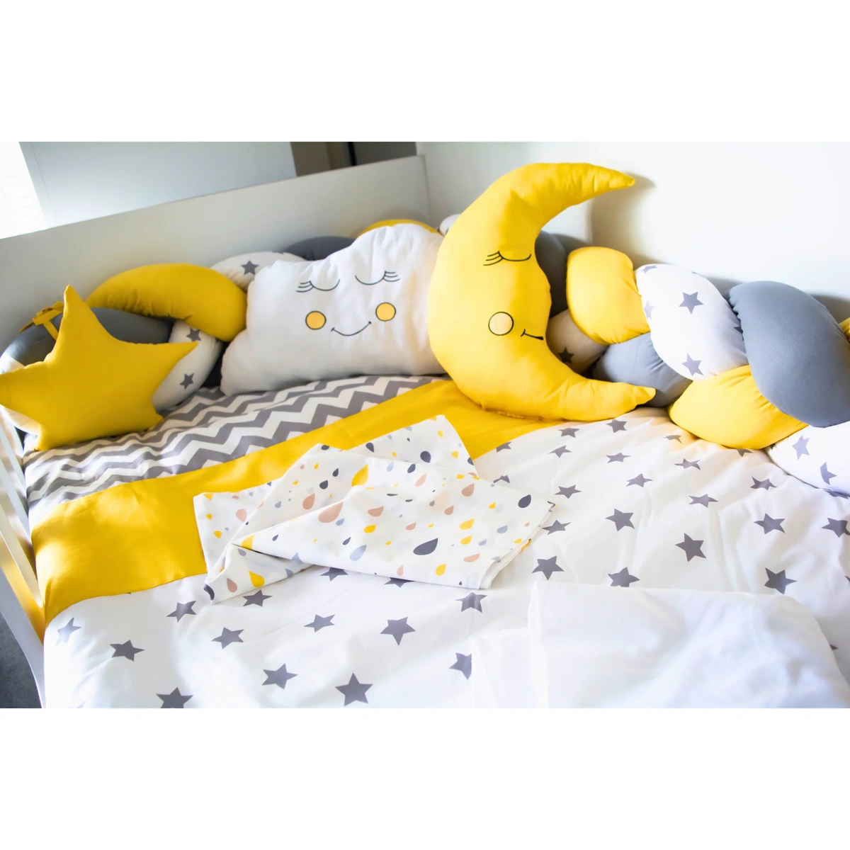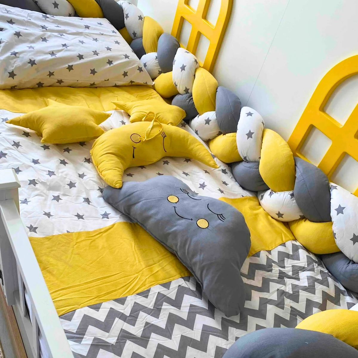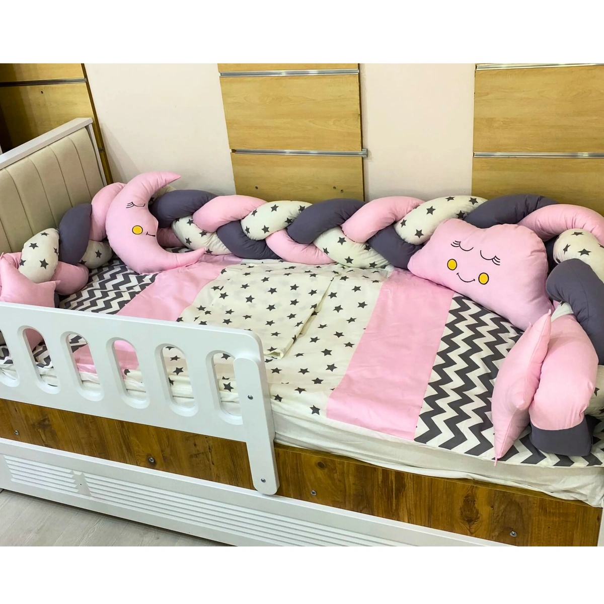 Zig Zag serisi montessori uyku seti, modern zikzak deseni ve yıldız motifli kumaşlarla tasarlanmış şık bir bebek uyku setidir. 90×190 cm montessori yataklara uyumlu olarak üretilmiştir.